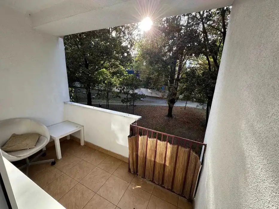 - Mieszkanie ma duży balkon z widokiem na zieleń.