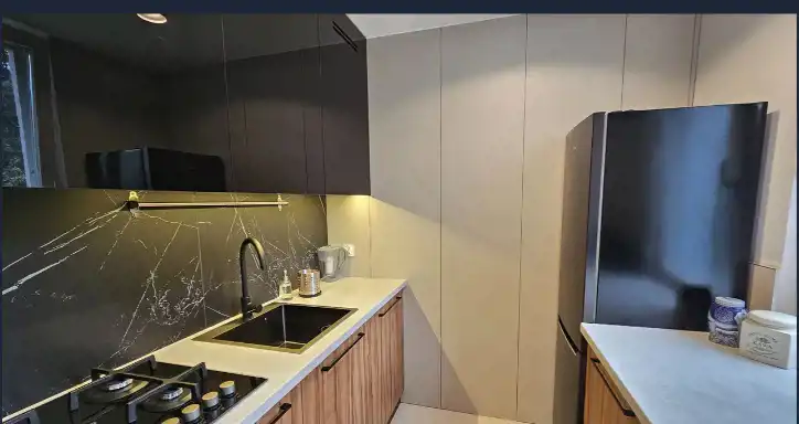 Oddzielna kuchnia (wyposażona m.in. w zabudowę, lodówkę i kuchenkę gazową).