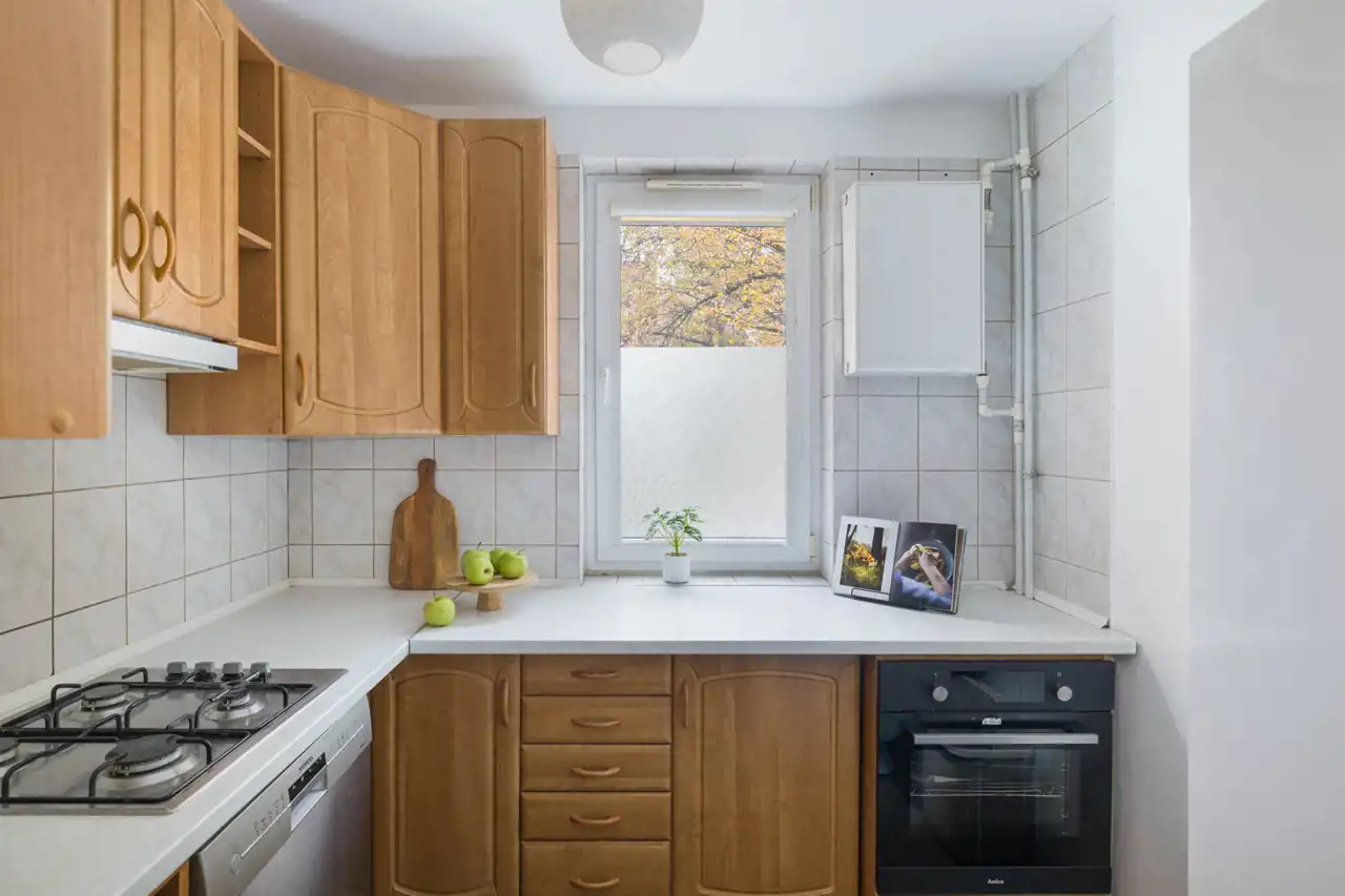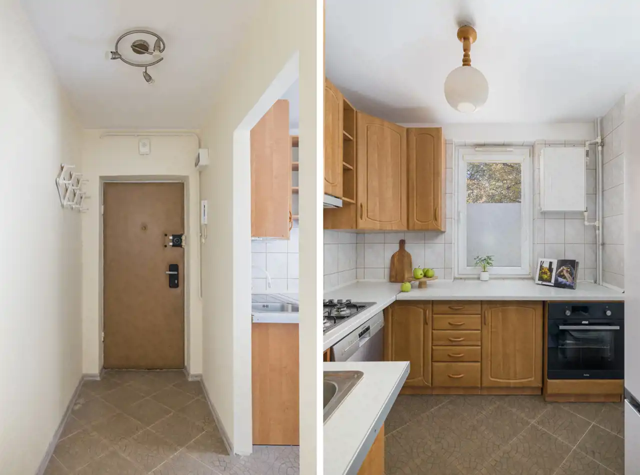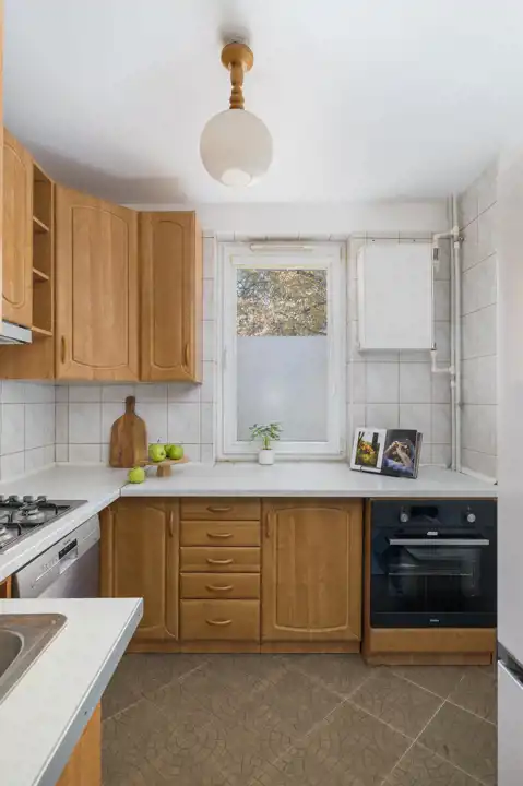 Wnętrze jest jasne, zadbane i funkcjonalnie zaprojektowane. Kuchnia została wyposażona w niezbędne sprzęty AGD, a mieszkanie jest umeblowane.