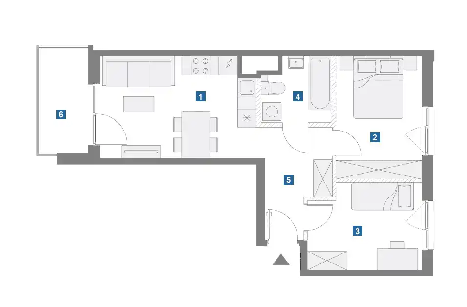 Salon z aneksem kuchennym i balkonem (o pow. 5,46), dwie oddzielne sypialnie, przedpokój, łazienka.
