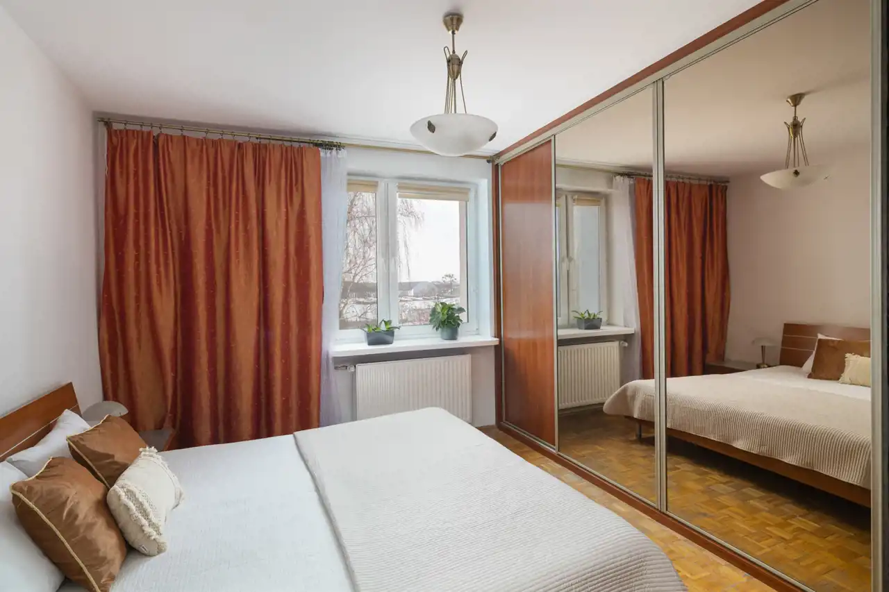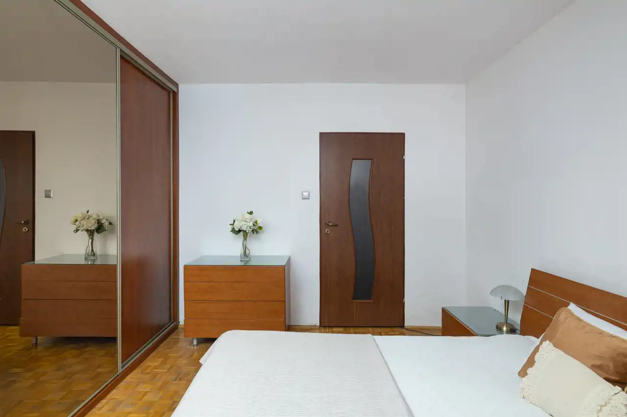 W sypialni znajduje się przestronna szafa wykonana na wymiar. Na podłodze w pokojach oraz w przedpokoju jest położony parkiet.