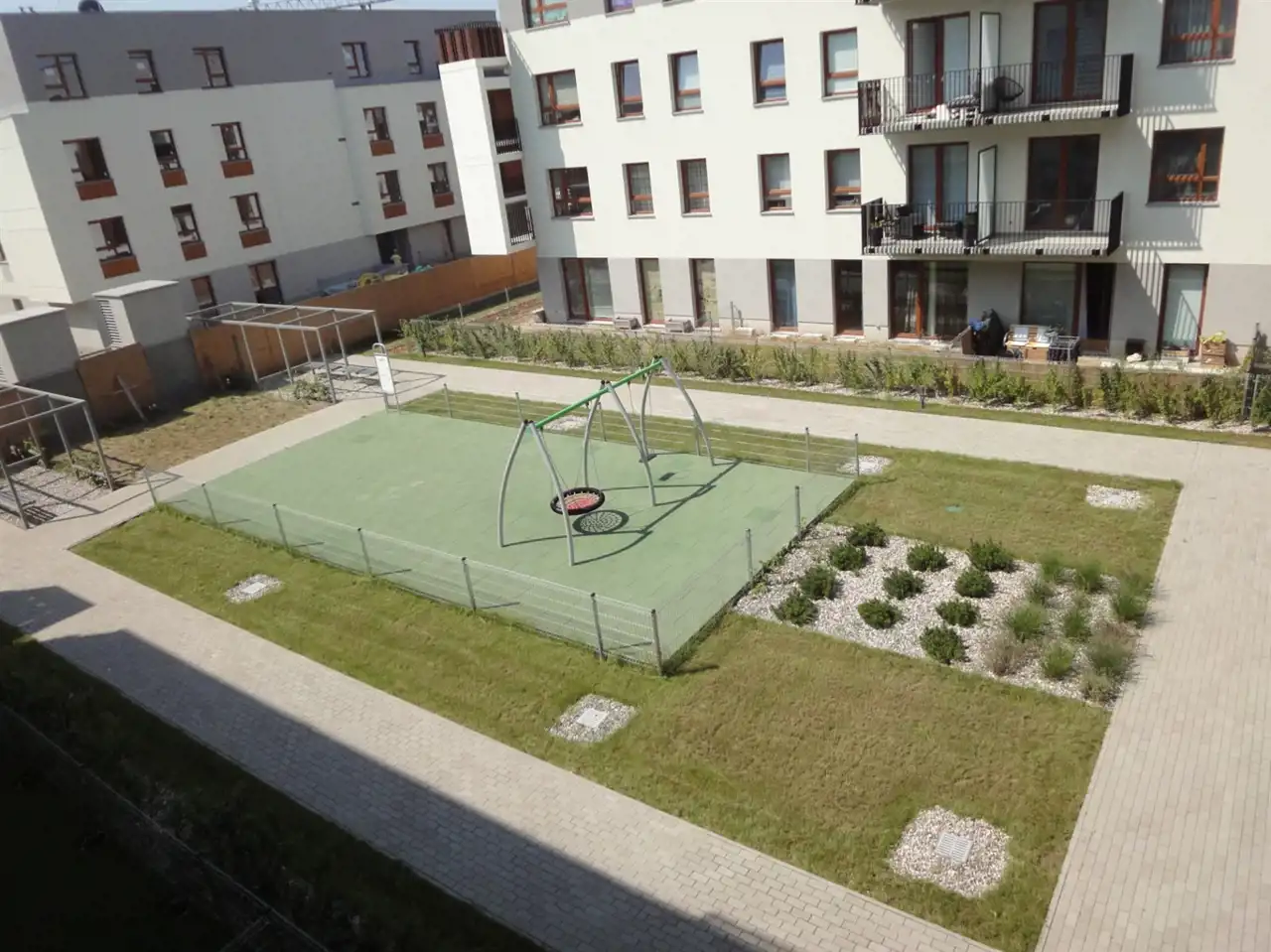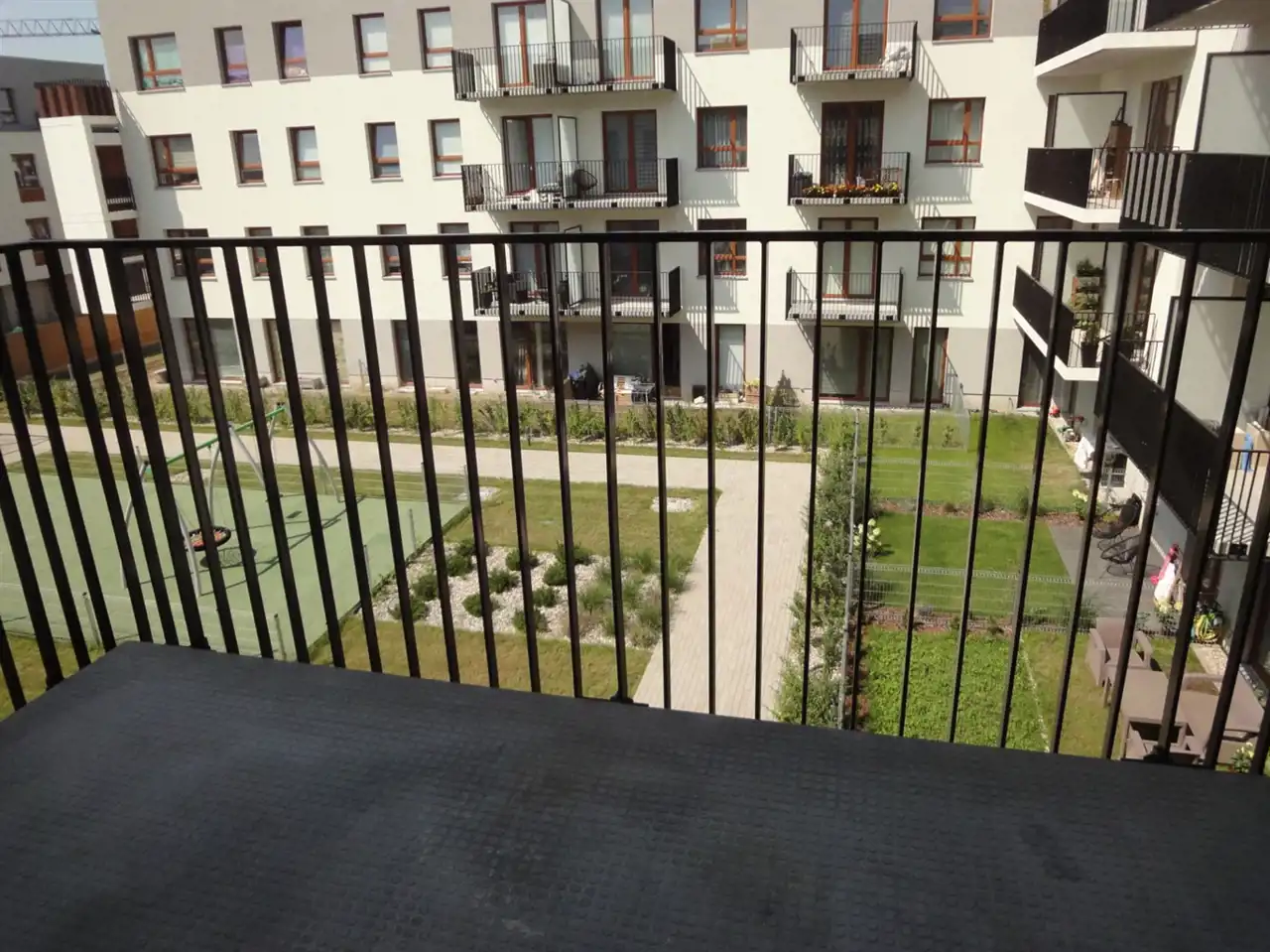 Okna w kierunku zachodnim, na ładnie zagospodarowany wewnętrzny dziedziniec (patio) z placem zabaw.