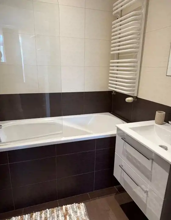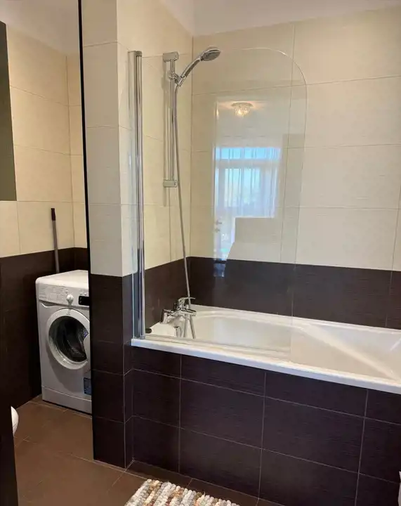 Pokój dzienny z aneksem kuchennym, ustawna sypialnia z szafą, duża łazienka z wanną oraz niewielki przedpokój.