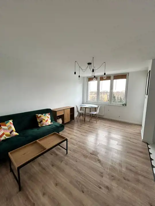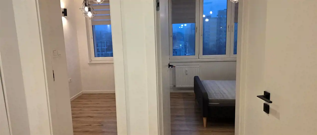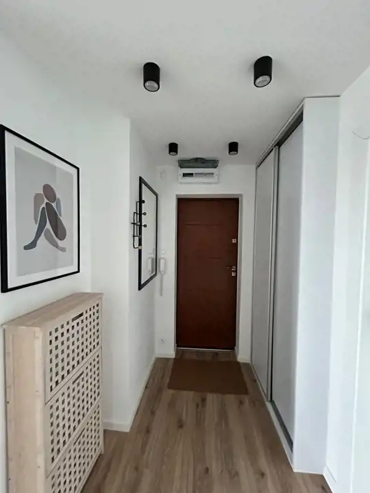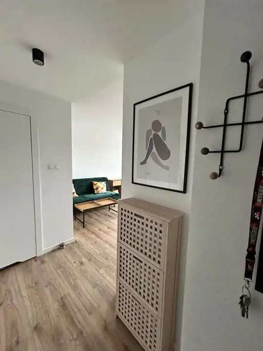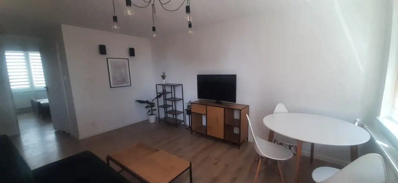 Elegancki salon połączony z kompleksowo wyposażoną kuchnią (łącznie ok 22m2) + 2 pokoje - jeden zaaranżowany na sypialnię (podwójne łózko, szafa), drugi może służyć jako gabinet + łazienka łącznie z toaletą, z kabiną prysznicową.