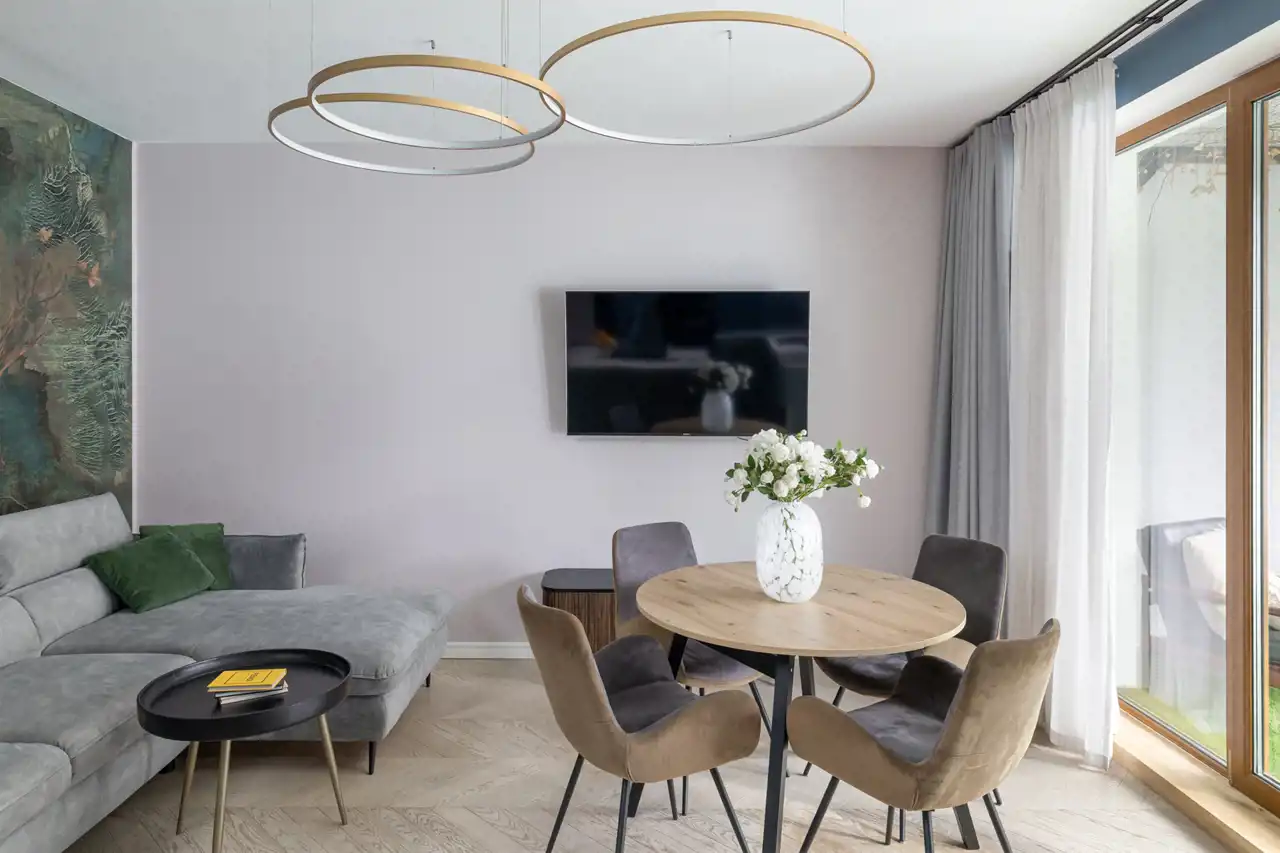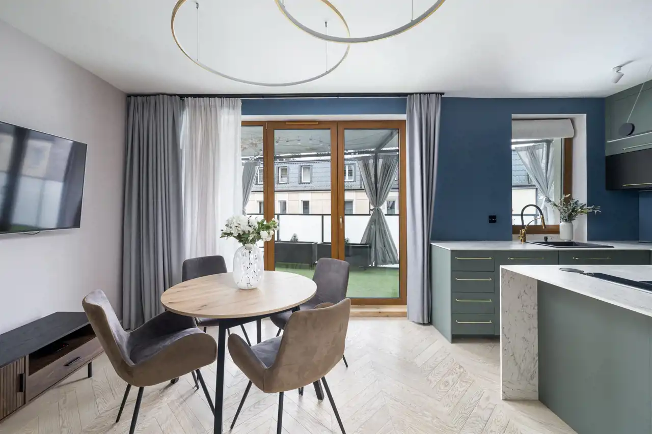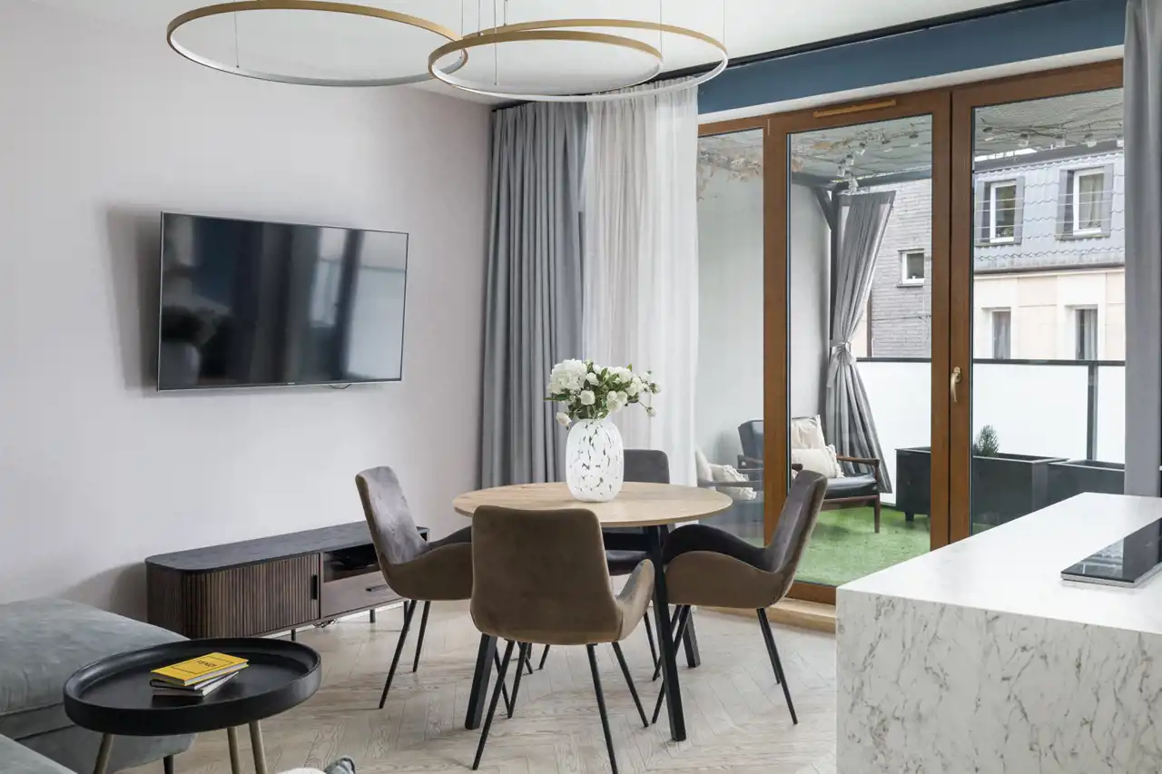 - Funkcjonalny układ pomieszczeń oraz ponad 12-metrowy taras z eleganckimi zasłonami zapewniającymi komfort i prywatność.
