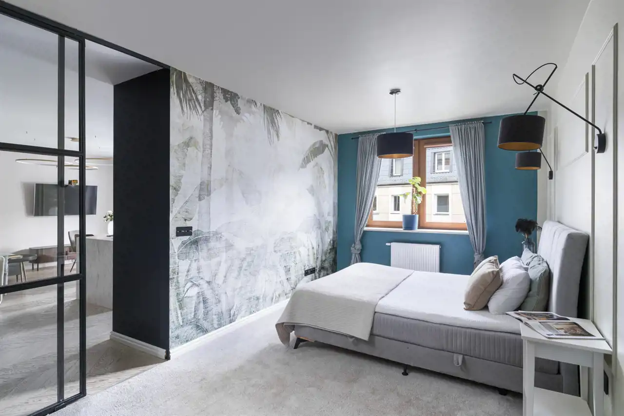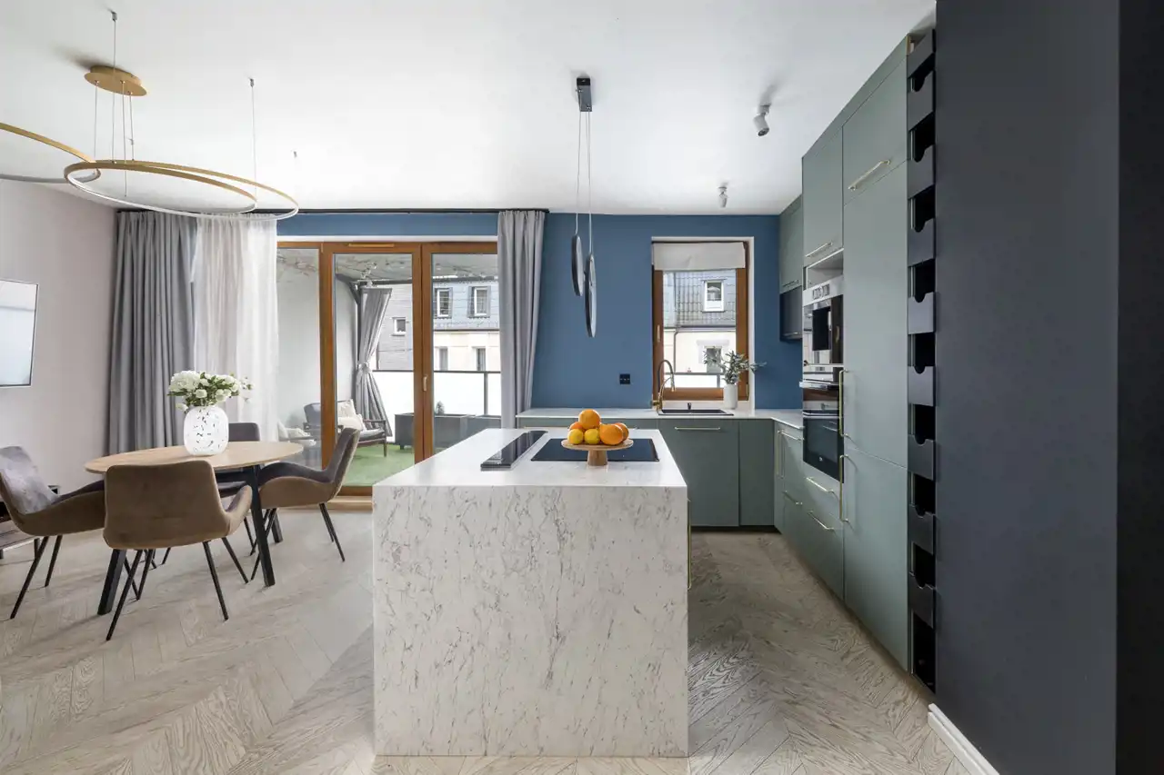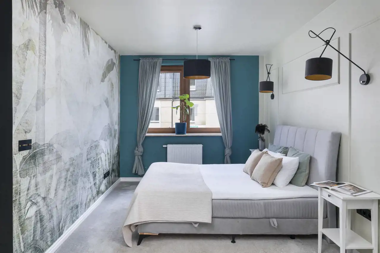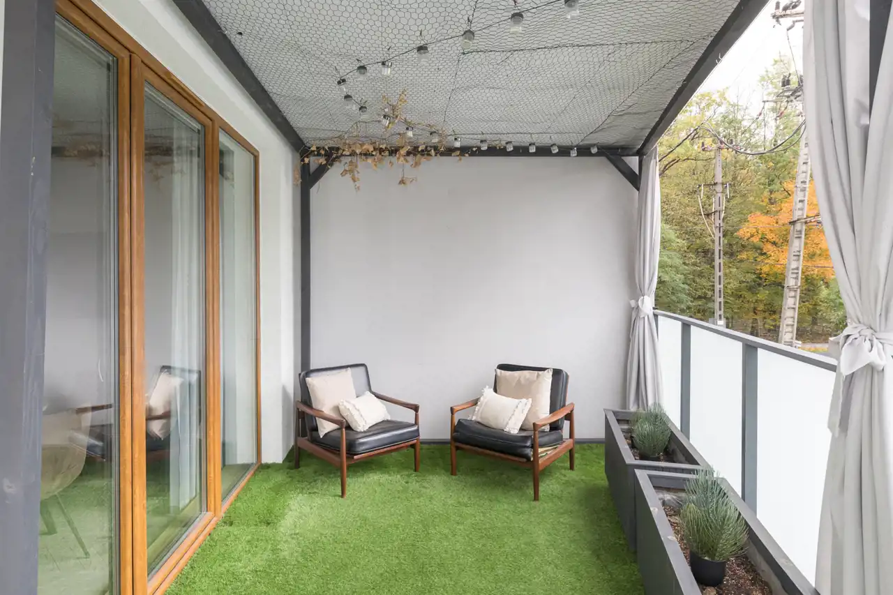 - Funkcjonalny układ pomieszczeń oraz ponad 12-metrowy taras z eleganckimi zasłonami zapewniającymi komfort i prywatność.