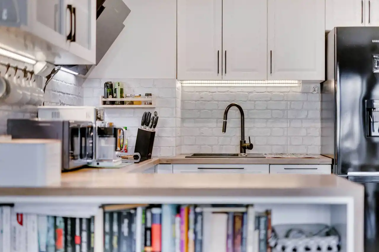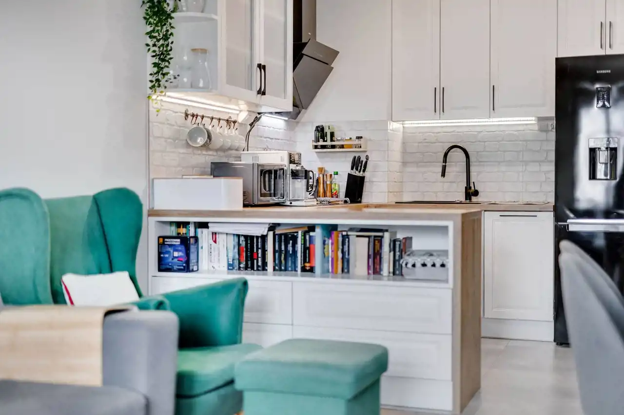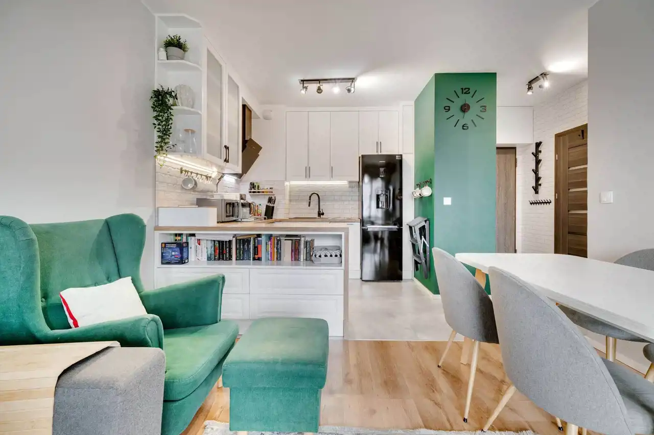 jasnego salonu z aneksem kuchennym,