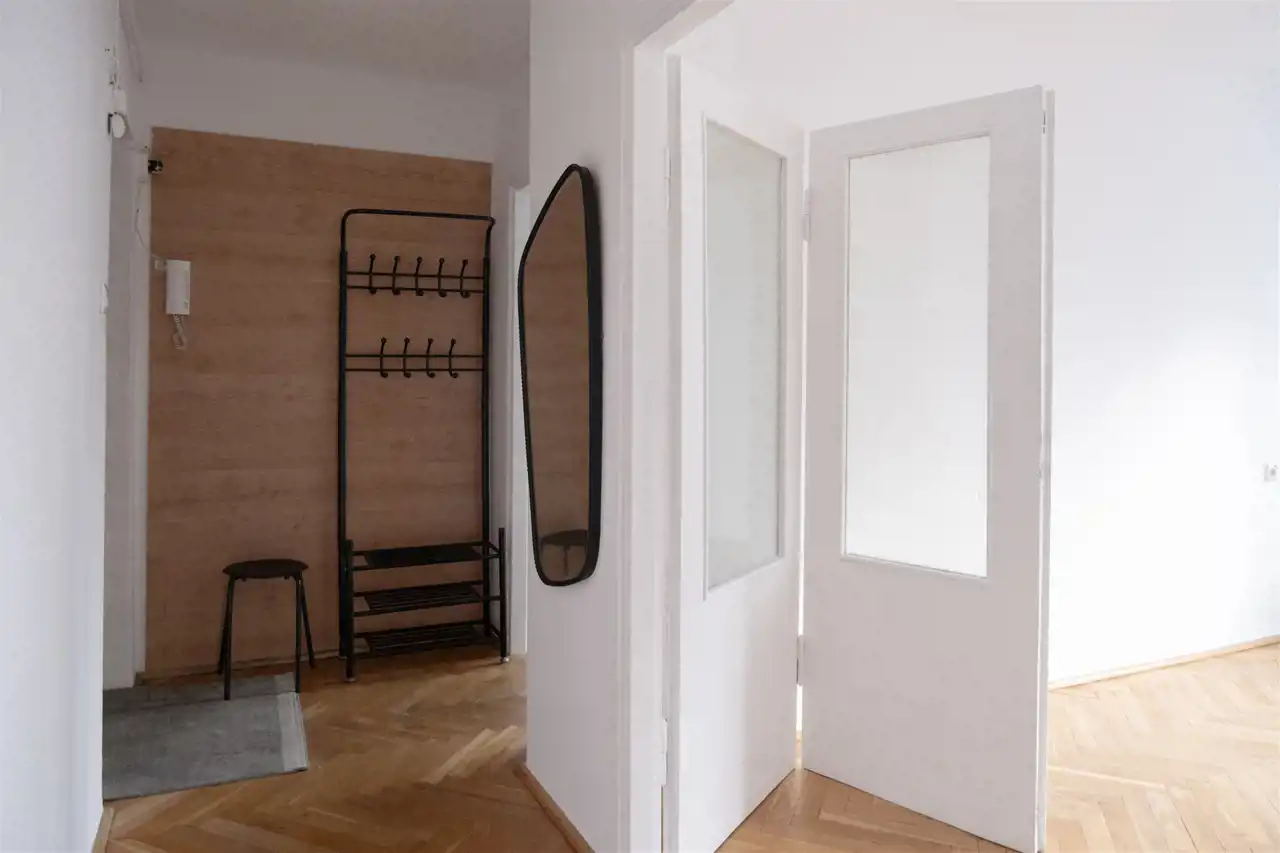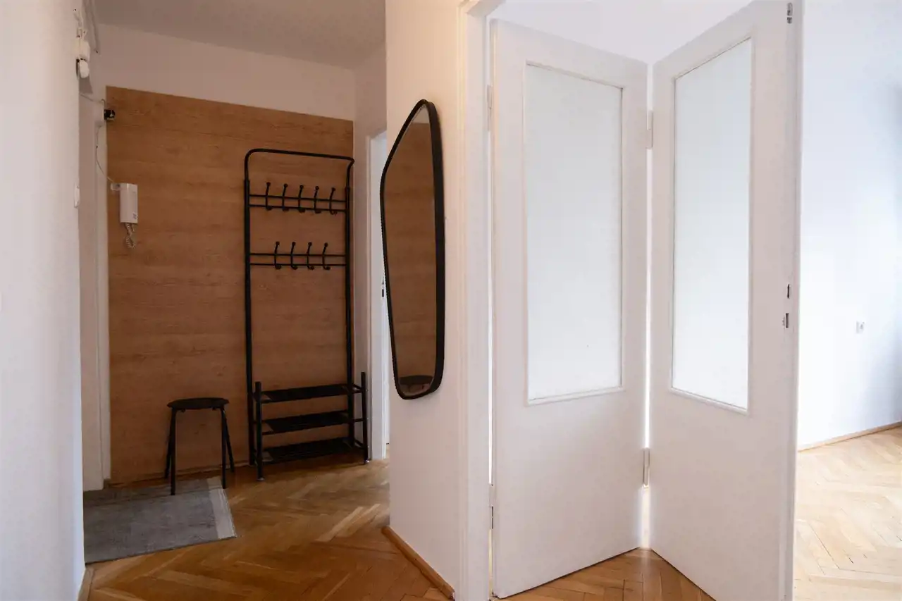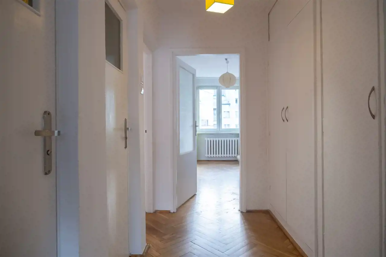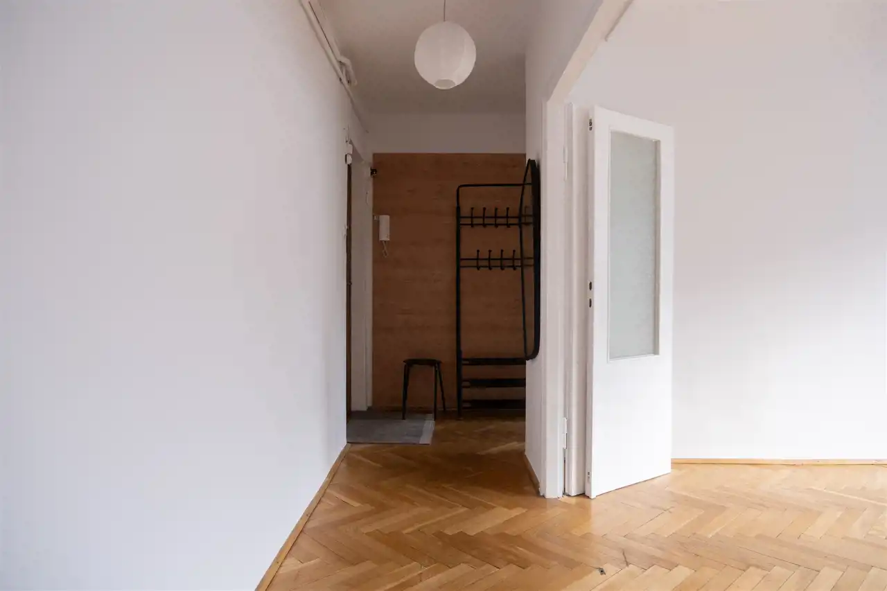 Składa się z przedpokoju, dużego salonu z pięknymi drewnianymi drzwiami, kuchni, łazienki i WC.