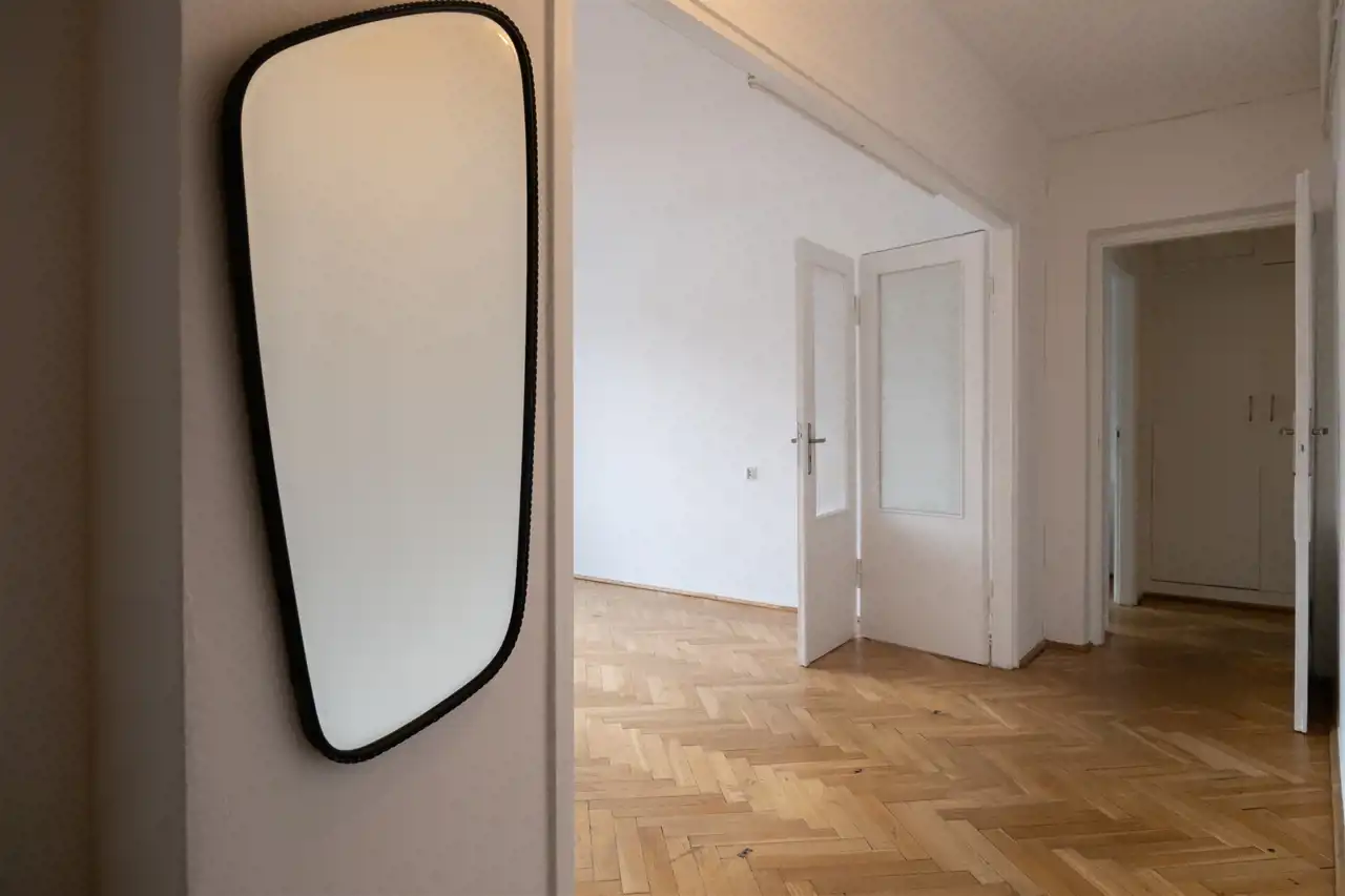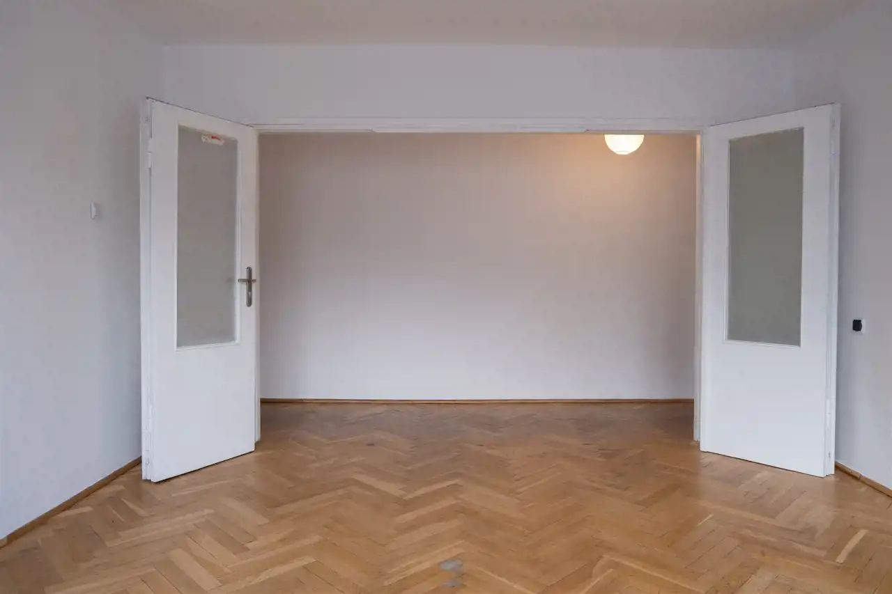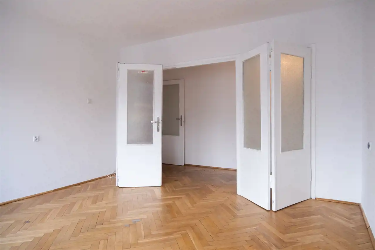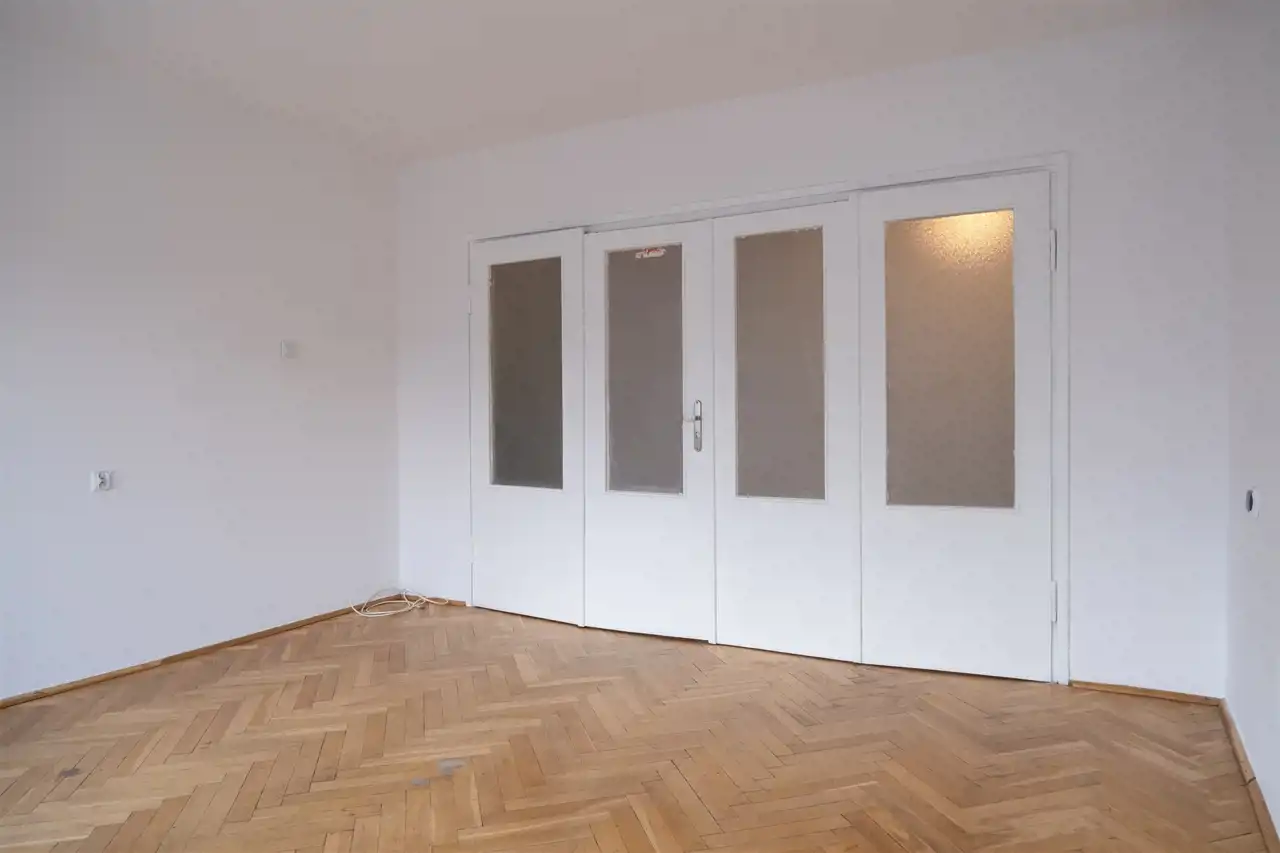 Składa się z przedpokoju, dużego salonu z pięknymi drewnianymi drzwiami, kuchni, łazienki i WC.
