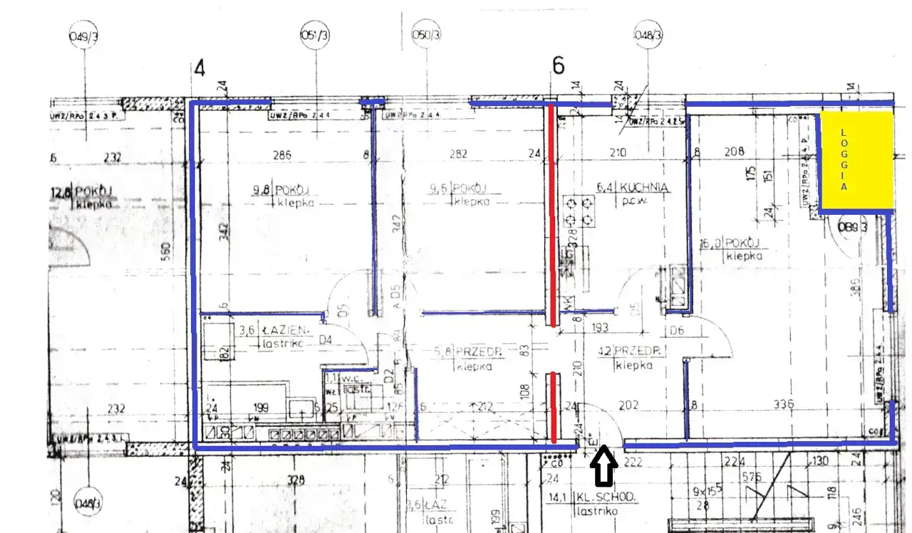 Tylko jedna ściana nośna, po usunięciu ścianki między kuchnią a pokojem powstanie duża ok 25 m2 otwarta przestrzeń; loggia do zaadaptowania.