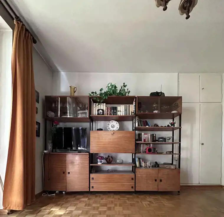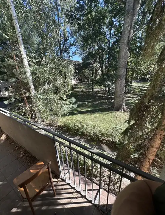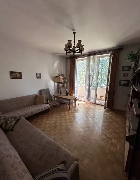 - salon z wyjściem na dużą loggię i widokiem na piękne, stare drzewa