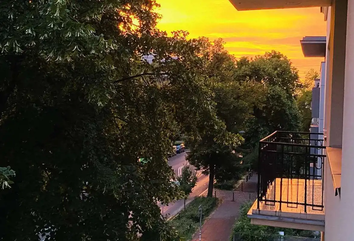 Duże okna oraz balkon (strona południowa) z widokiem na zieleń.