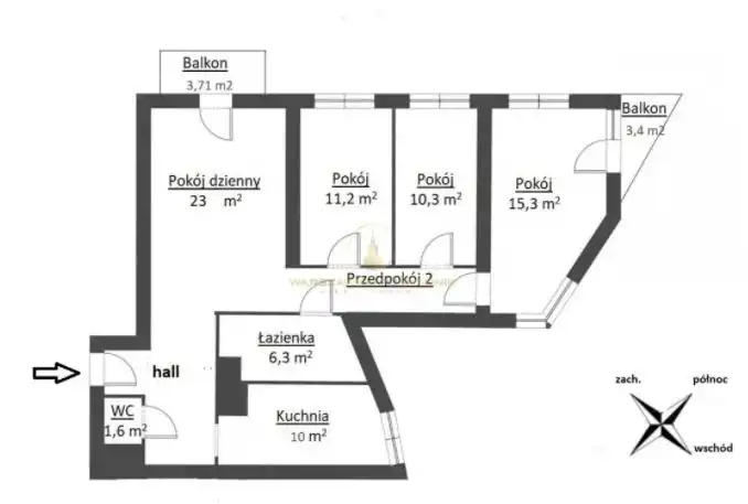 Okna salonu wraz z balkonem oraz 2 sypialni są skierowane na południowy zachód, Okna głównej sypialni wraz z balkonem na południowy zachód i północny wschód,