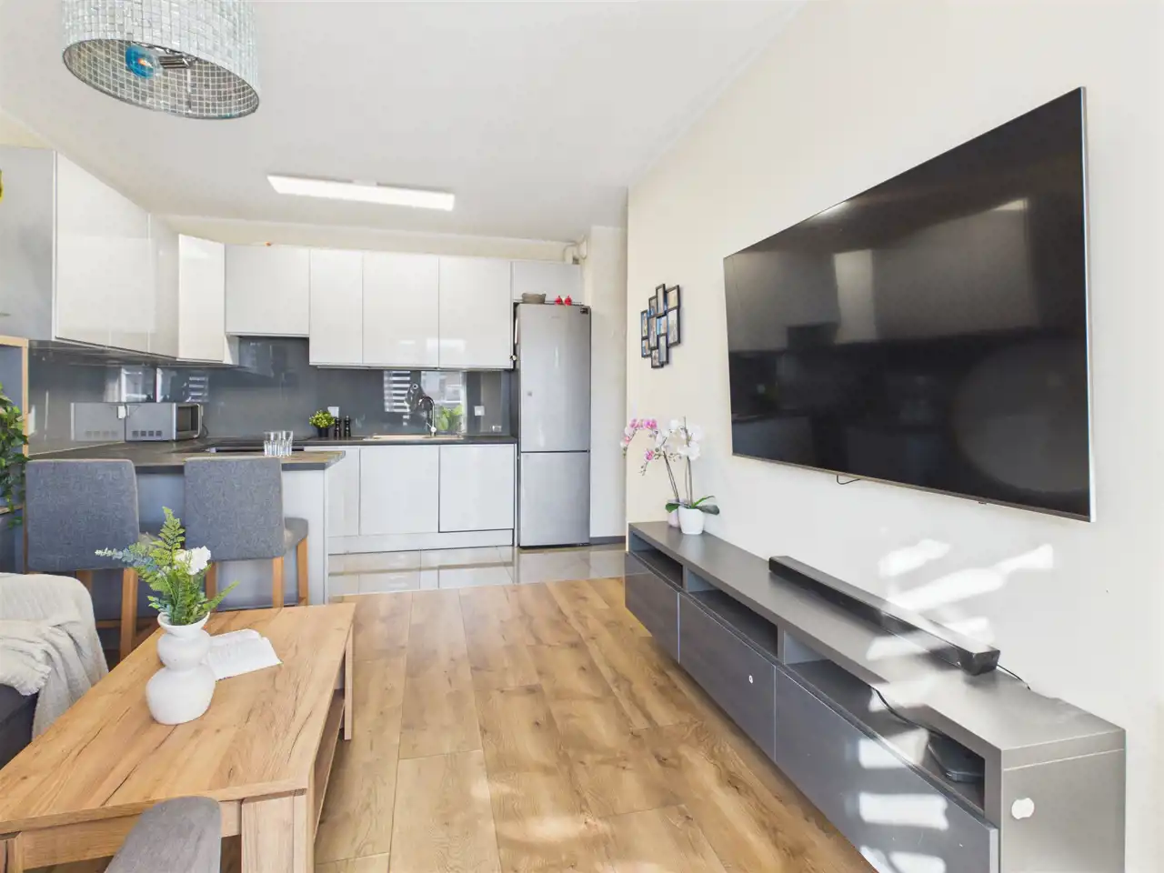 przestronny salon z aneksem kuchennym,