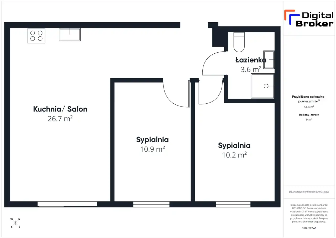 Z salonu prowadzi wyjście na balkon o powierzchni 9 m², stanowiący dodatkową przestrzeń do wypoczynku.