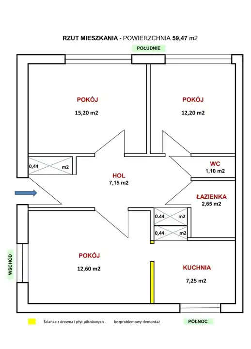 - Charakterystyka mieszkania 59.47 m2, 3 pokoje