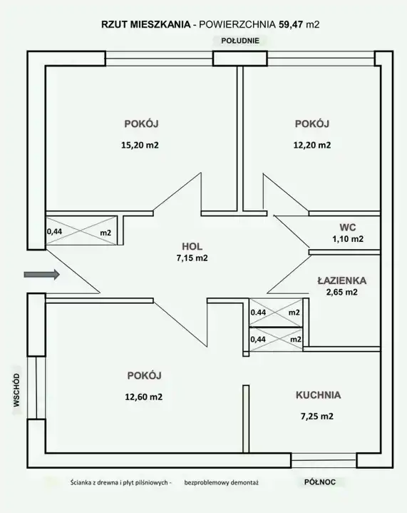 - Charakterystyka mieszkania 59.5 m2, 3 pokoje