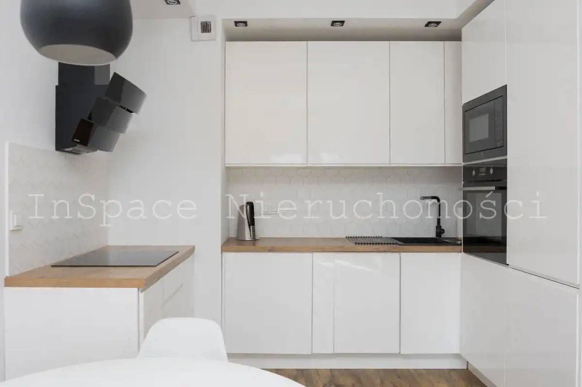 Aneks kuchenny - szafki stojące i wiszące w zabudowie robione na zamówienie. Kuchnia wyposażona w : lodówka w zabudowie, piekarnik, mikrofalówka, zmywarka, płyta indukcyjna, okap kuchenny.