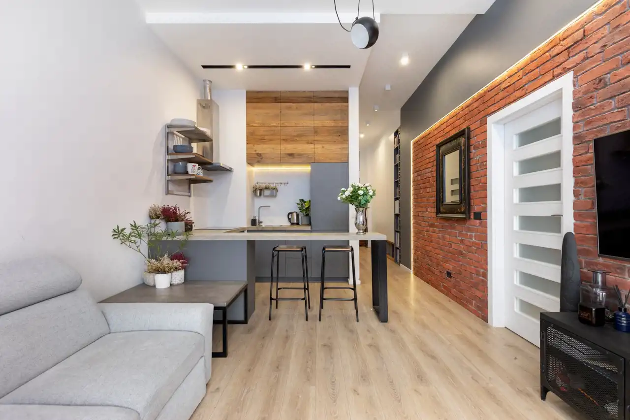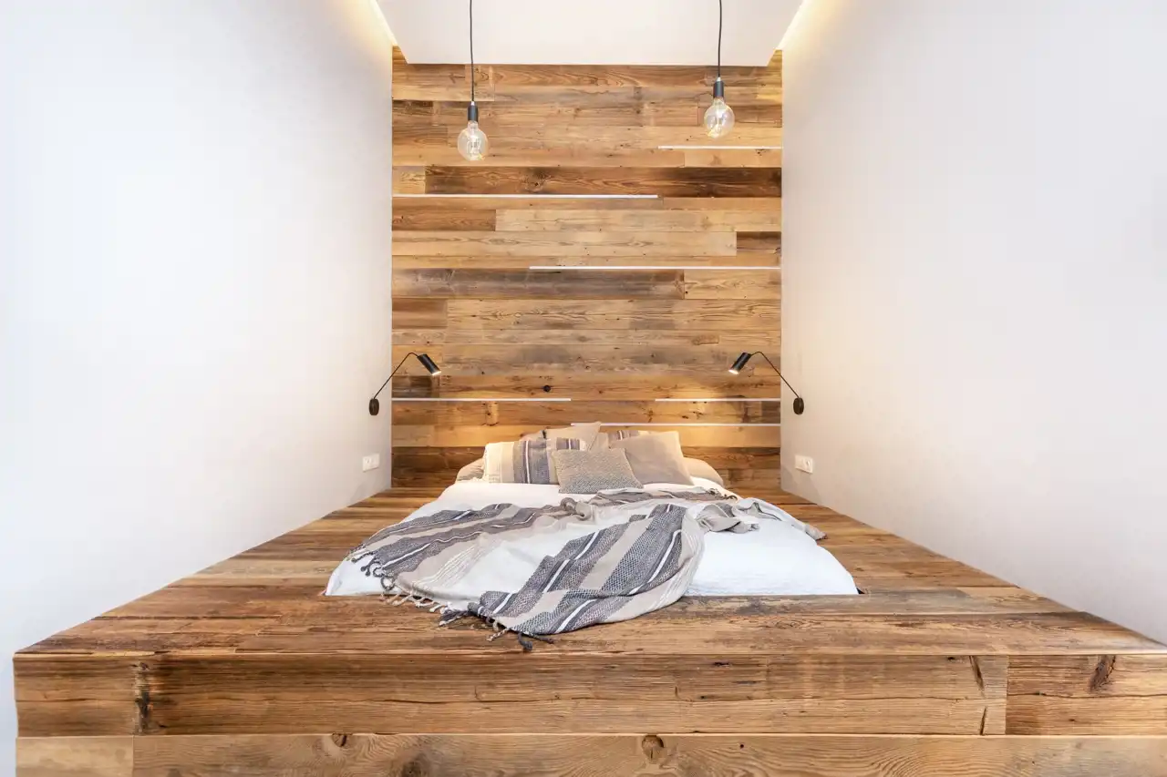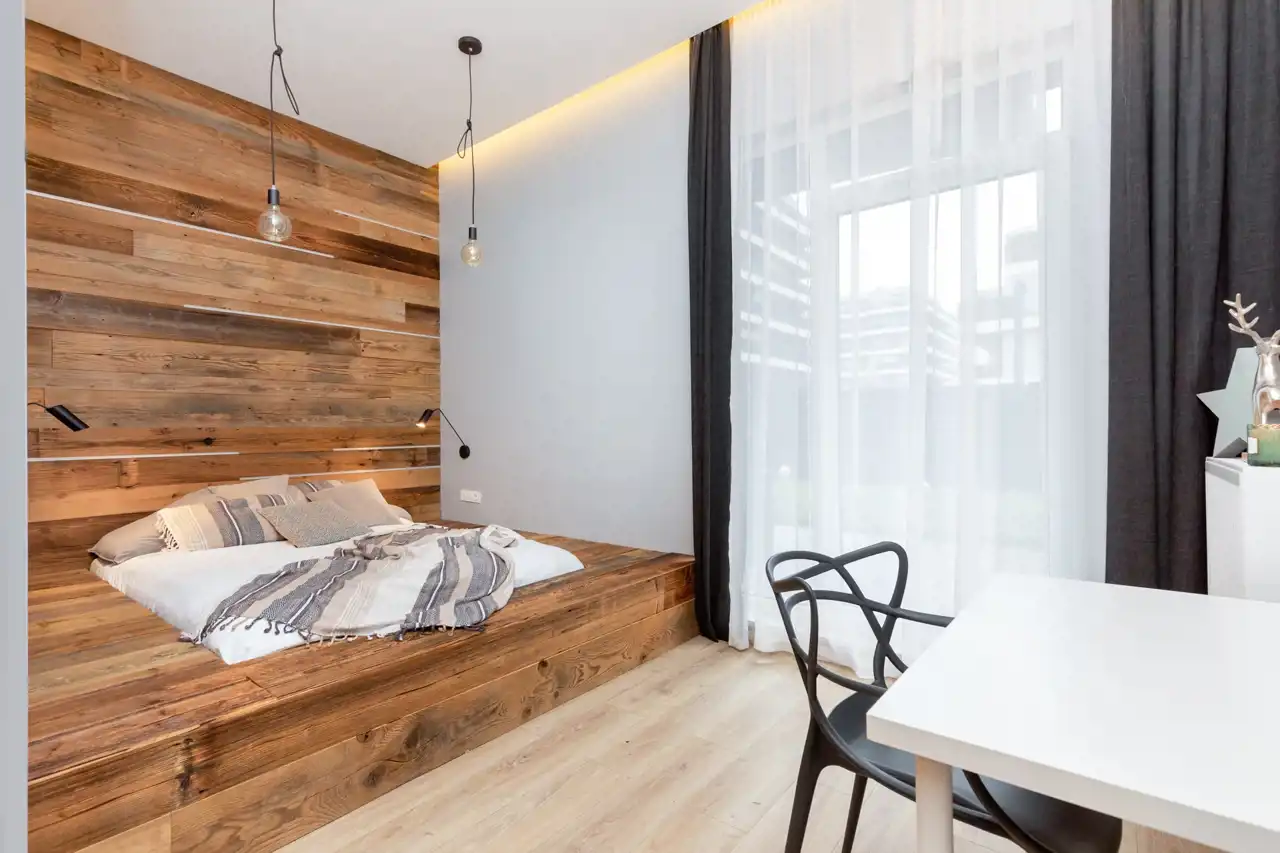 - Oryginalne elementy wykończenia nadające wnętrzu charakteru: elementy cegły na ścianie w salonie oraz unikatowe detale wykonane z desek ze starej stodoły - m.in. łóżko i górne fronty w kuchni.