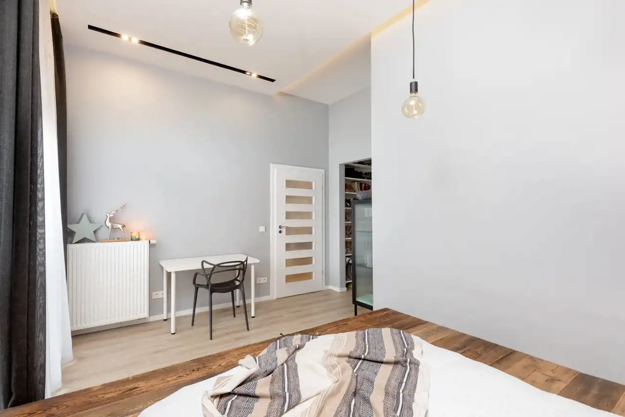 - Sypialnia z możliwością postawienia biurka do pracy zdalnej oraz wyjściem na taras.