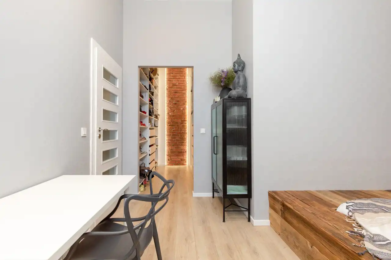 - Duża, funkcjonalna garderoba oferująca mnóstwo miejsca do przechowywania.