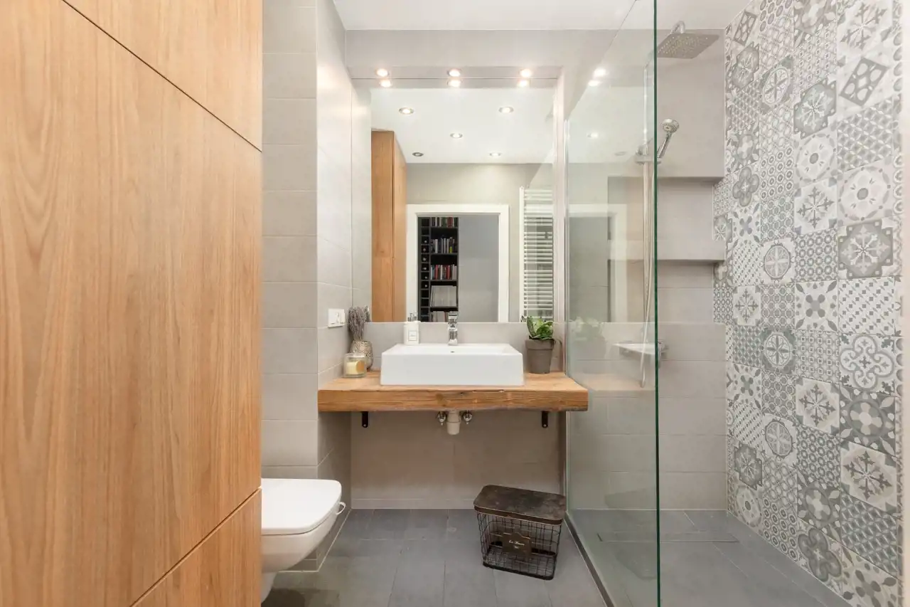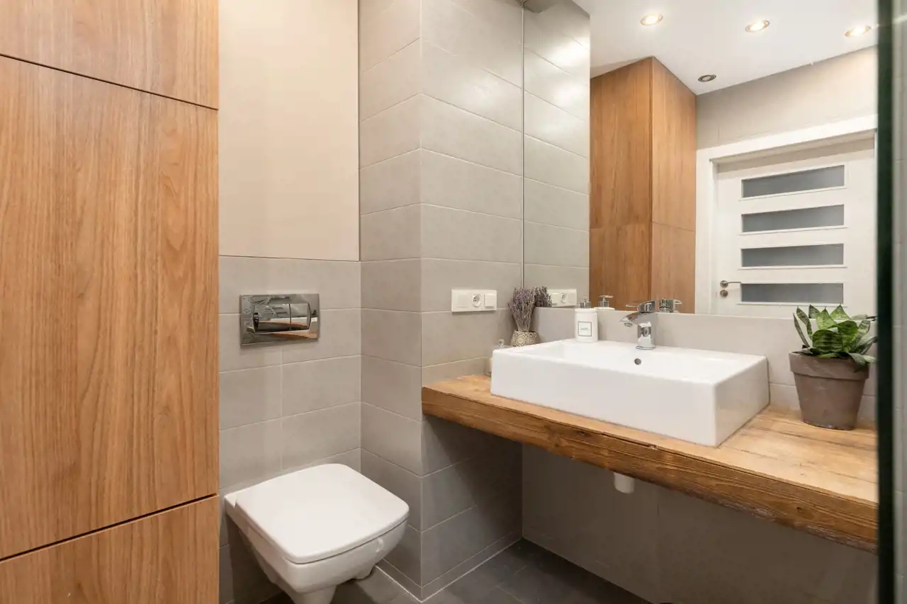- Łazienka w pełni wyposażona min.: prysznic walk-in, zabudowę meblową, wc, umywalkę, lustro oraz pralkę.