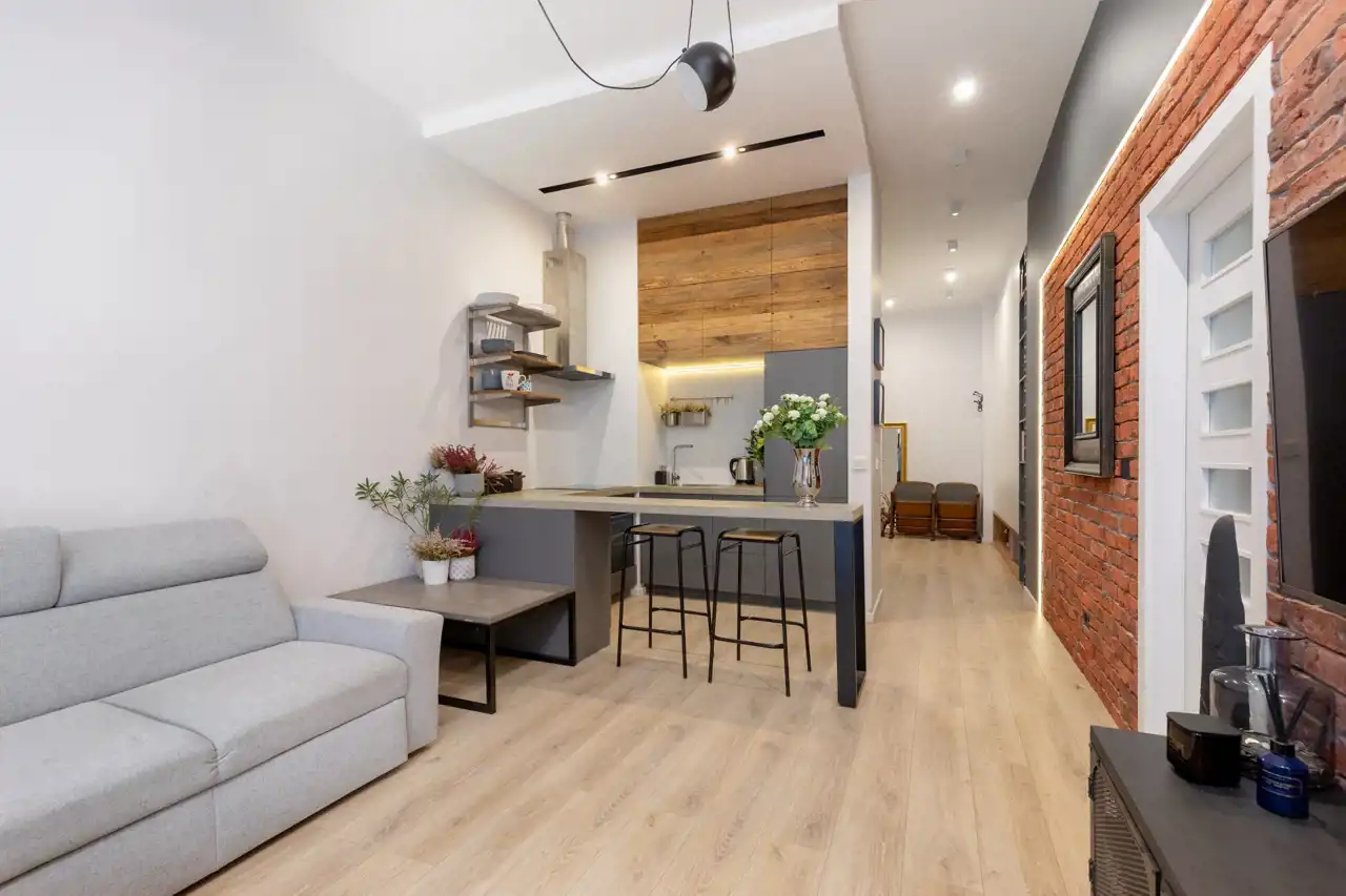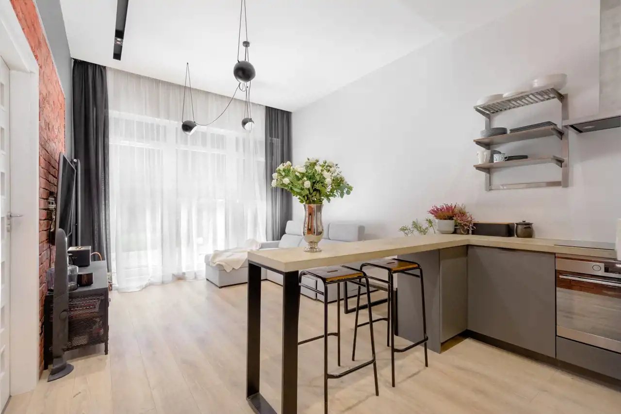 - Funkcjonalny układ z podziałem na strefę dzienną i prywatną, salon z aneksem wyposażony w rozkładaną sofą, telewizor, szafkę rtv oraz sprzęt AGD (lodówko-zamrażarka, okap, płyta indukcyjna, zmywarka, piekarnik).