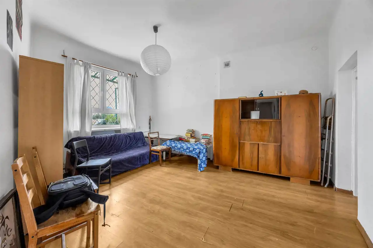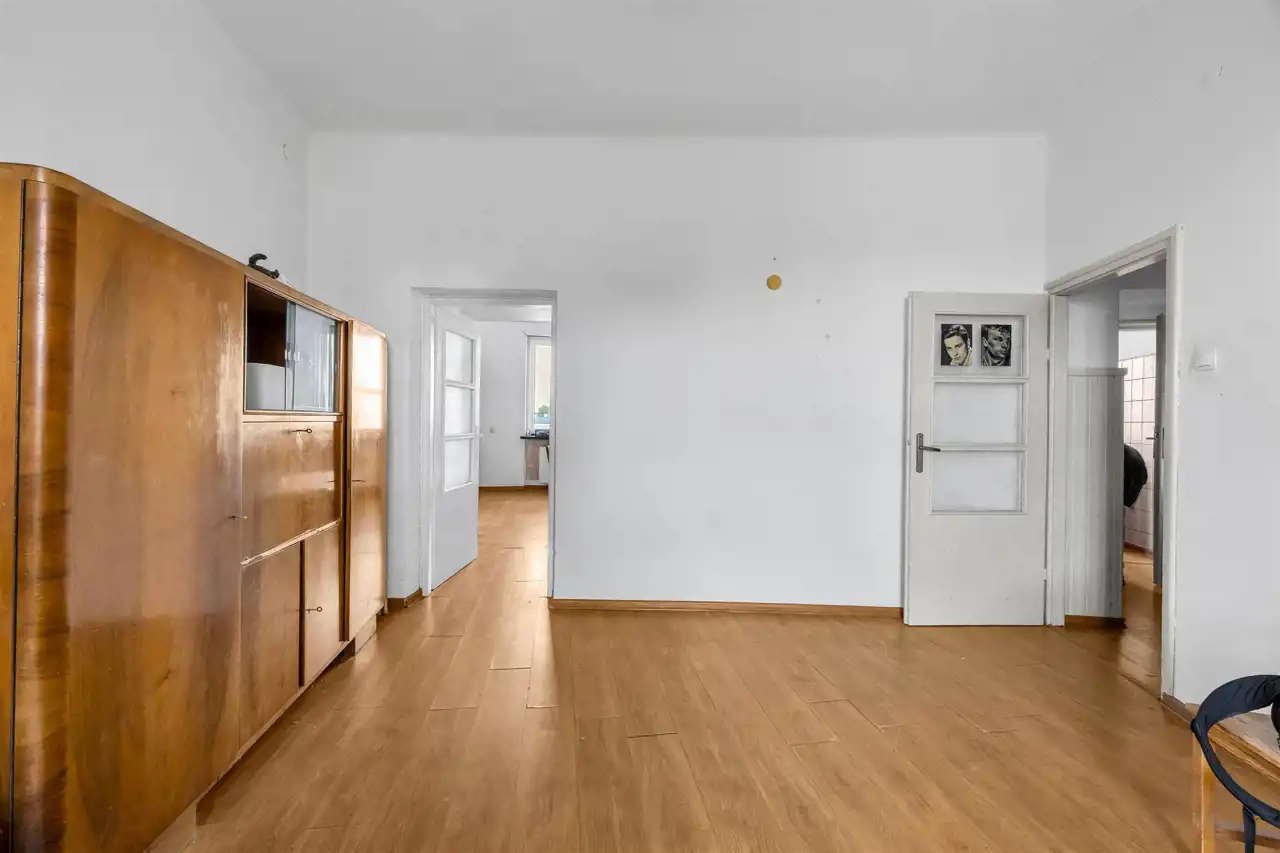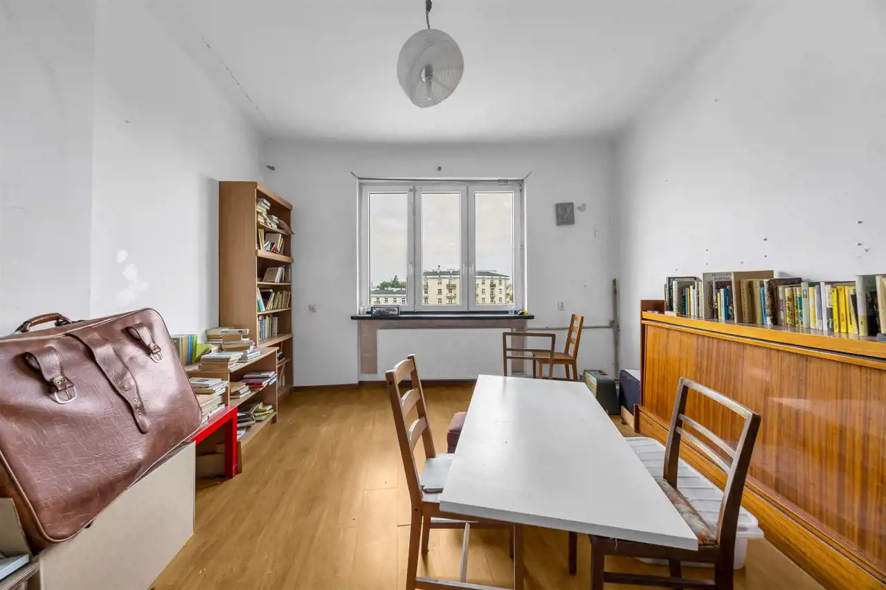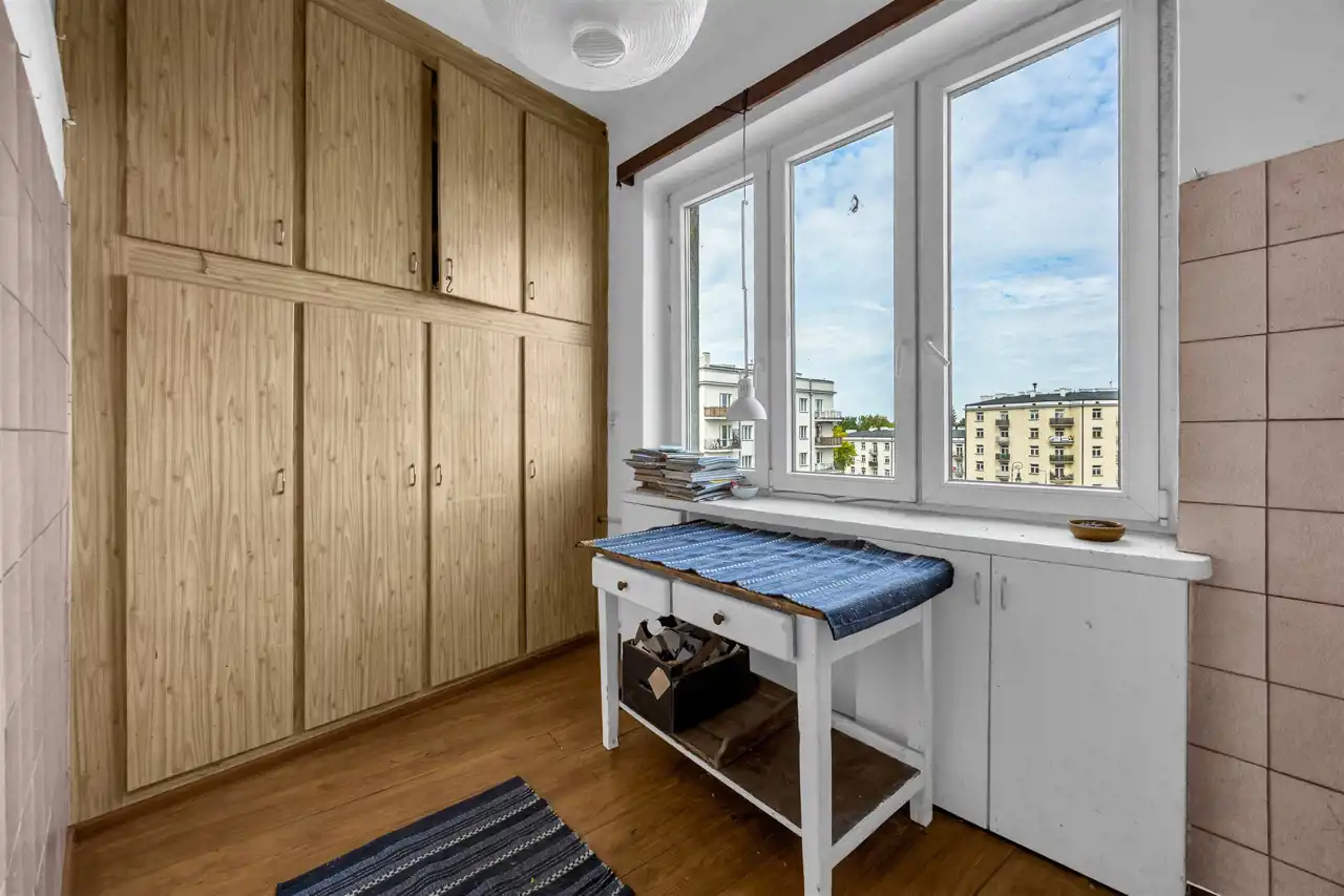Mieszkanie wysokie, dwustronne w stanie do remontu, ewentualnego odświeżenia w zależności od potrzeb. Duży pokój, w stronę Placu Wilsona, duża kuchnia również na Plac Wilsona oraz sypialnia na galerię i zielone, zagospodarowane podwórko z bajecznym widokiem. Łazienka z kabiną prysznicową. Przedpokój z szafami.