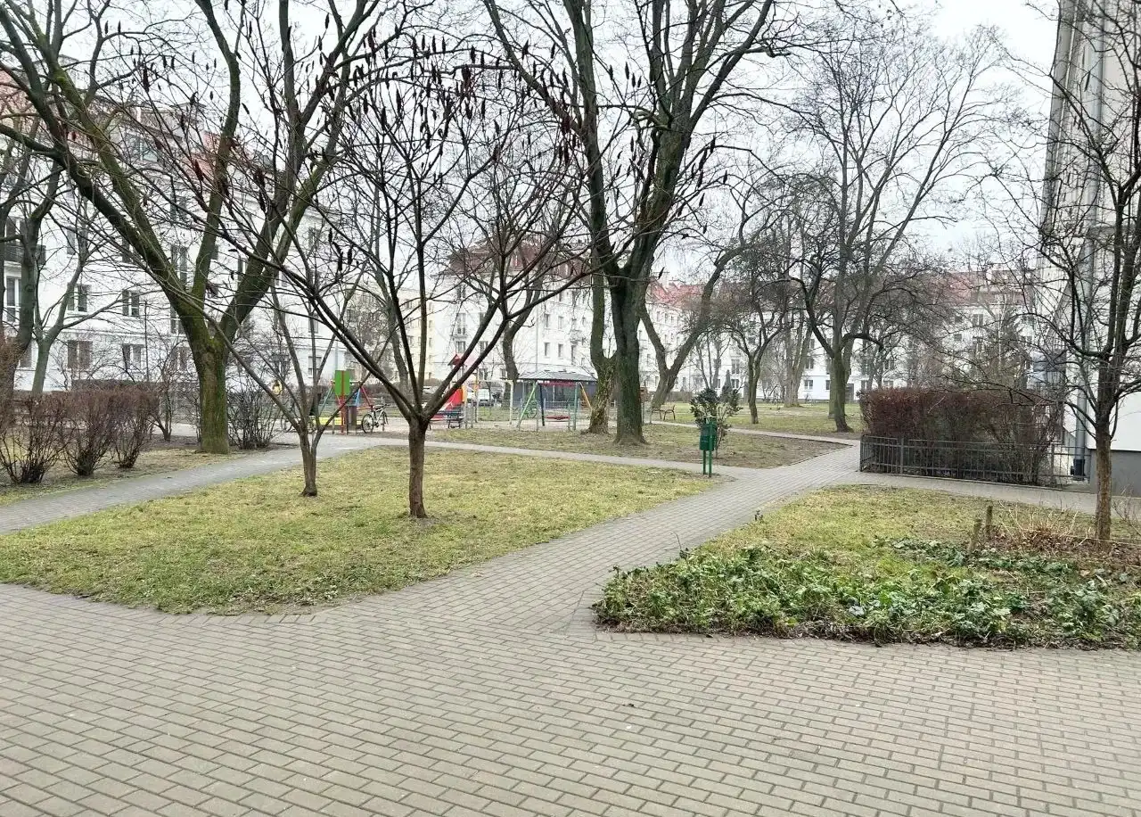 Ekspozycja południowo-zachodnia sprawia, że mieszkanie jest pełne naturalnego światła, a widok z okien na zielony skwer dodaje uroku. W pobliżu znajduje się przestronny dziedziniec z zielenią i placem zabaw.