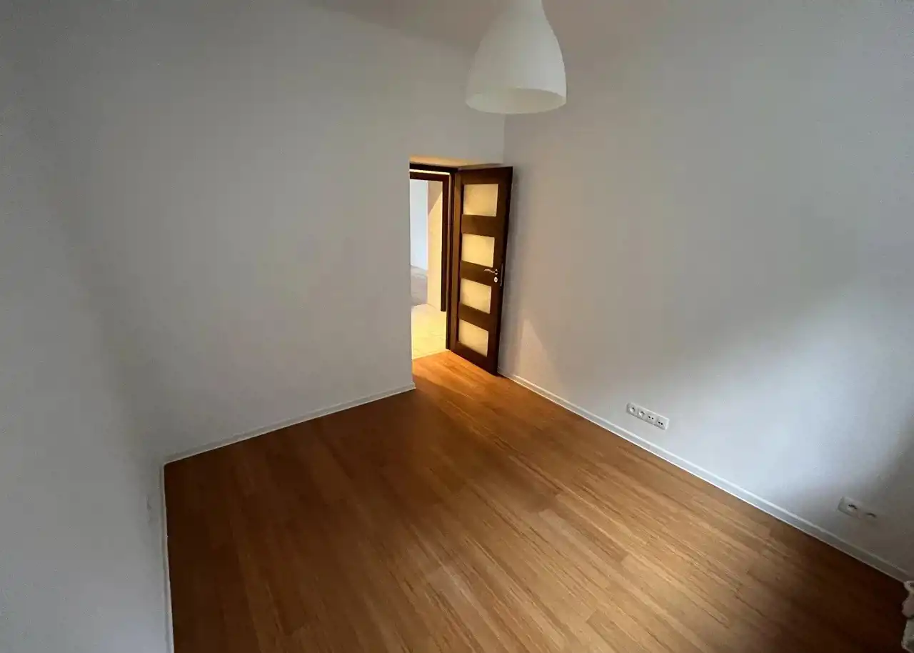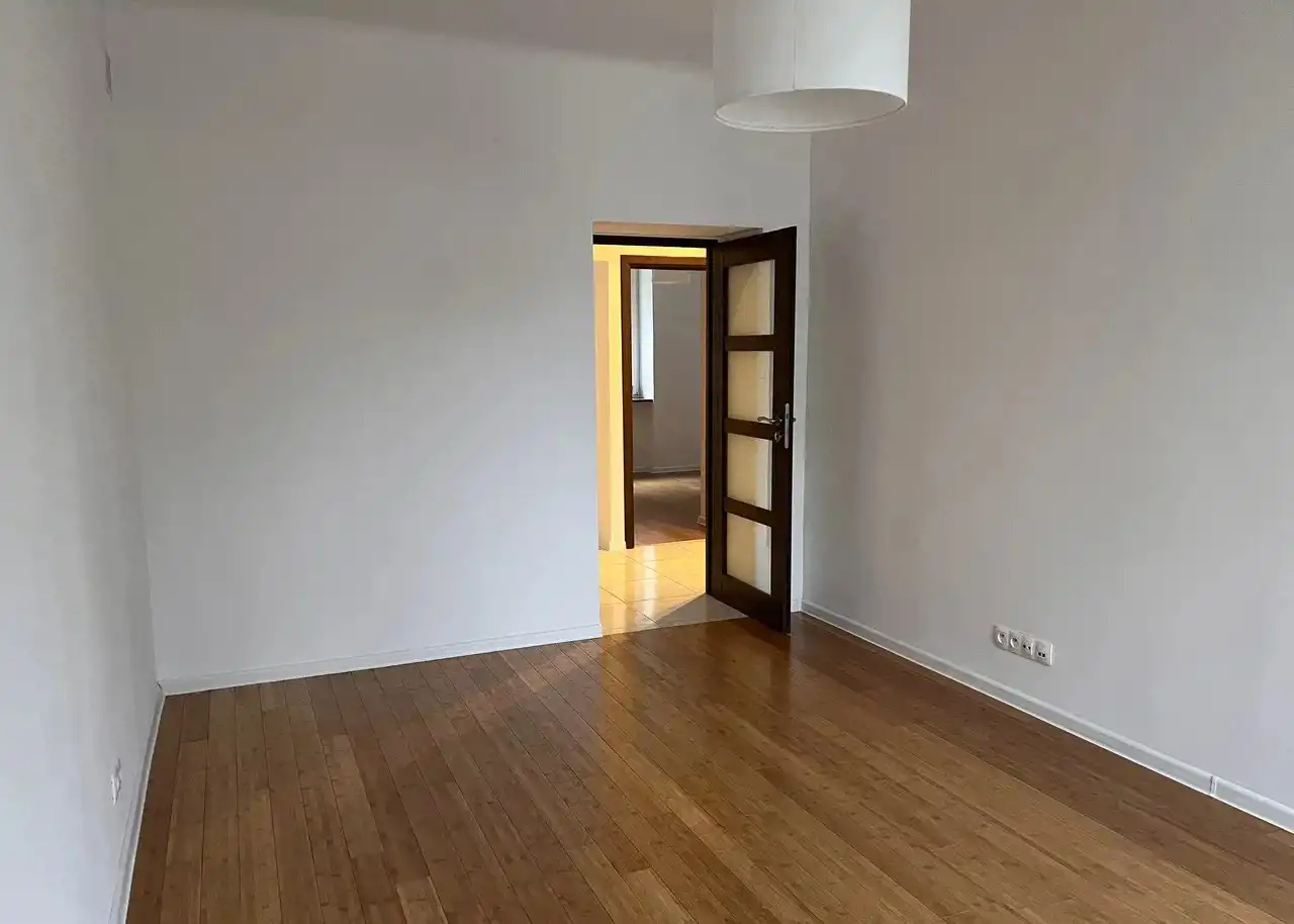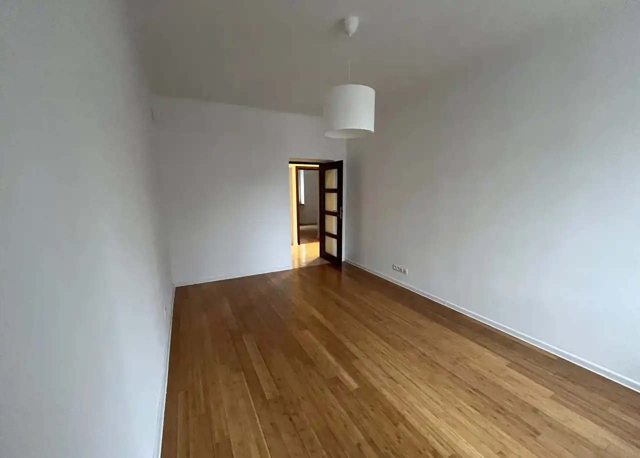 - Obecnie na podłodze znajduje się wykładzina, jednak pod nią zachowany jest bambusowy parkiet.