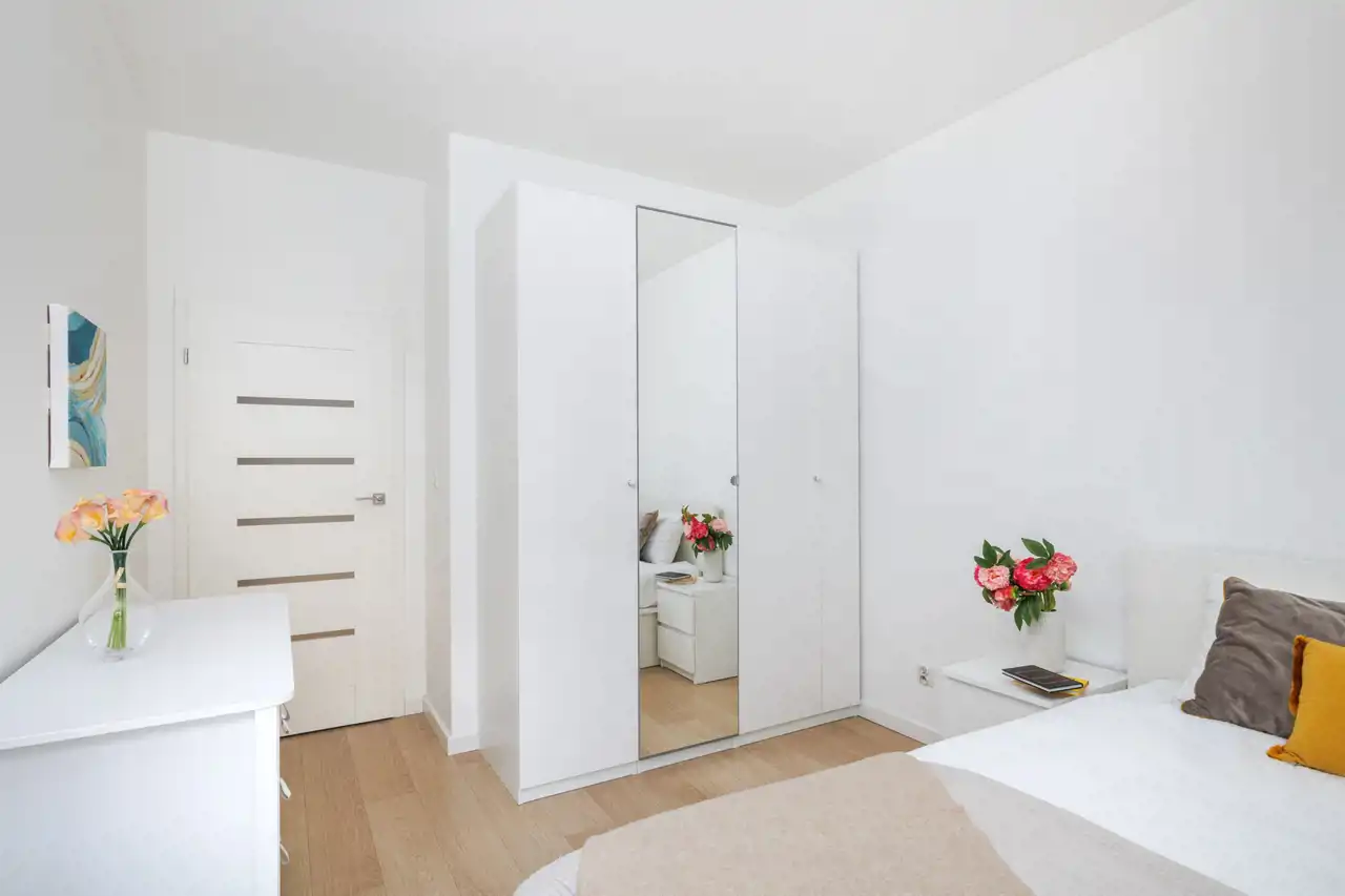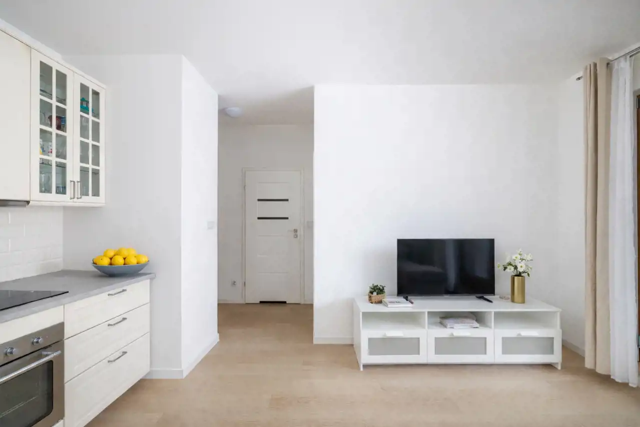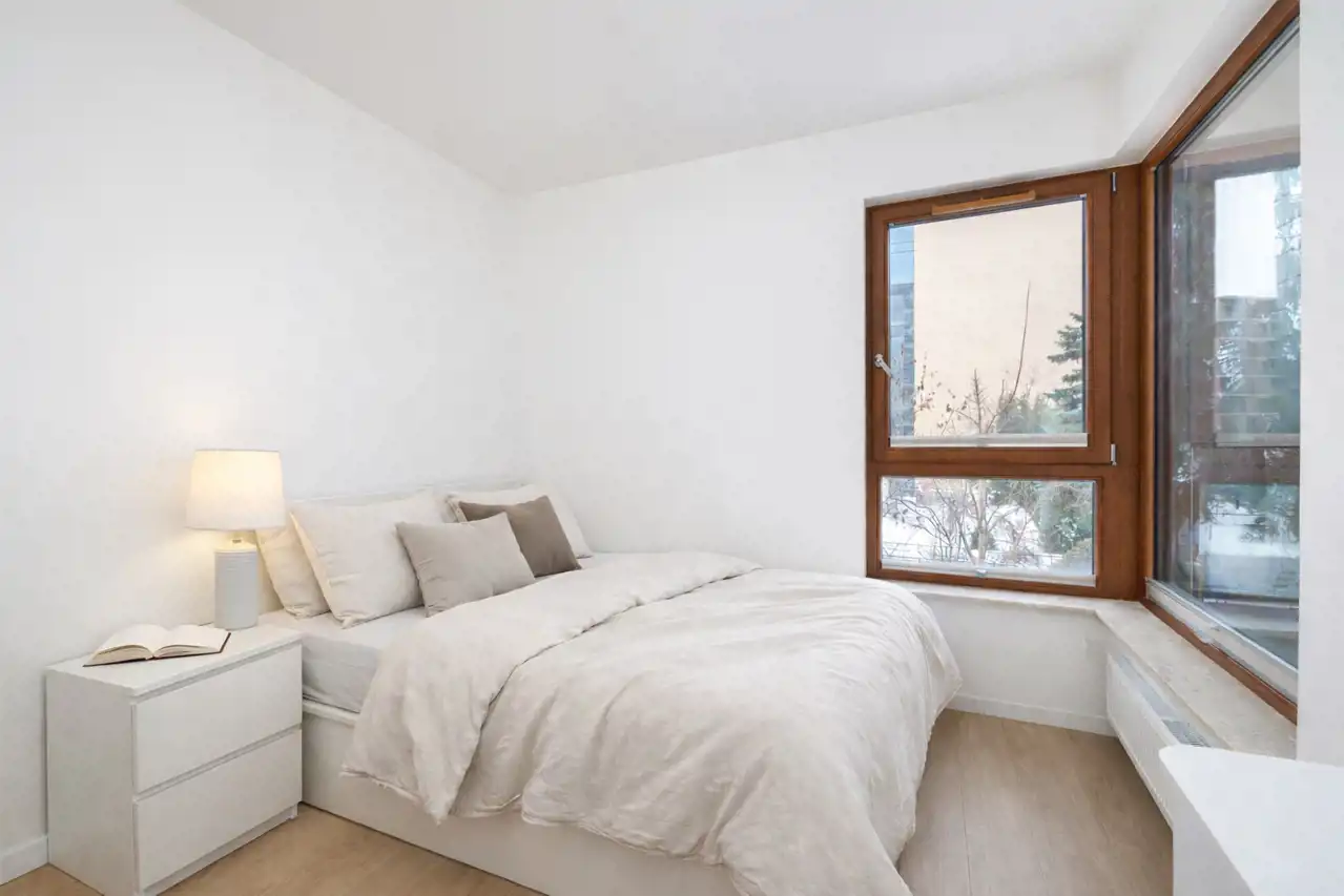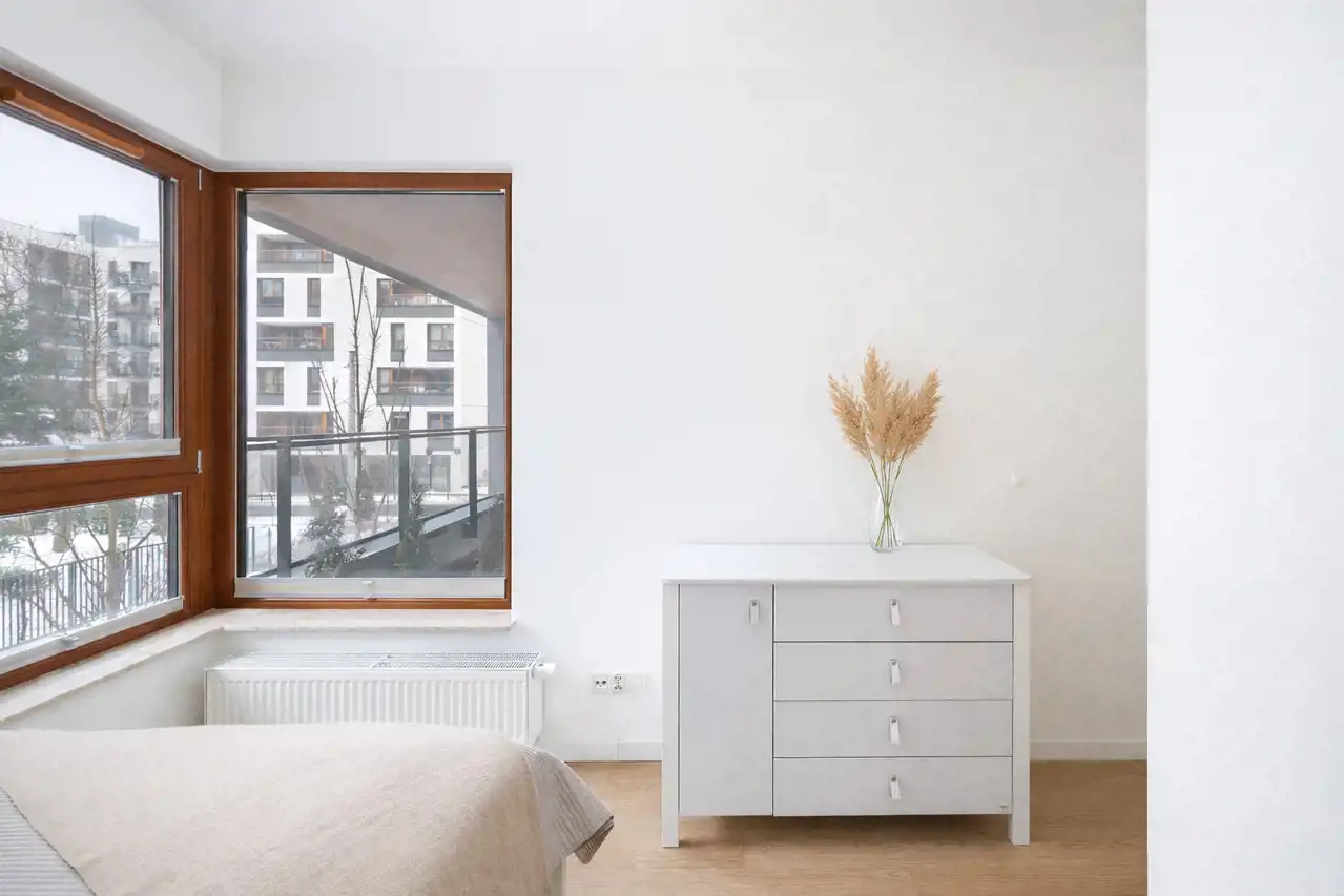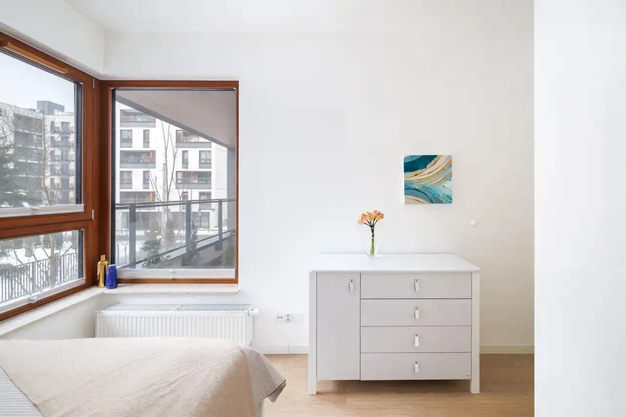 Wnętrze zostało urządzone funkcjonalnie i w nowoczesnym stylu. Duże okna zapewniają bardzo dobre doświetlenie pomieszczeń, a drewniana stolarka okienna z nawiewnikami i filtrami antysmogowymi wpływa na komfort codziennego użytkowania. Salon z aneksem kuchennym stanowi wygodną, otwartą przestrzeń dzienną z wyjściem na loggię. Aneks kuchenny wyposażony jest w meble w zabudowie, zmywarkę, płytę oraz piekarnik. Sypialnia z pojemną szafą oferuje komfortową przestrzeń do odpoczynku. W łazience znajduje się duży prysznic typu walk-in. Dodatkowe miejsce do przechowywania zapewnia szafa KOMANDOR w przedpokoju.