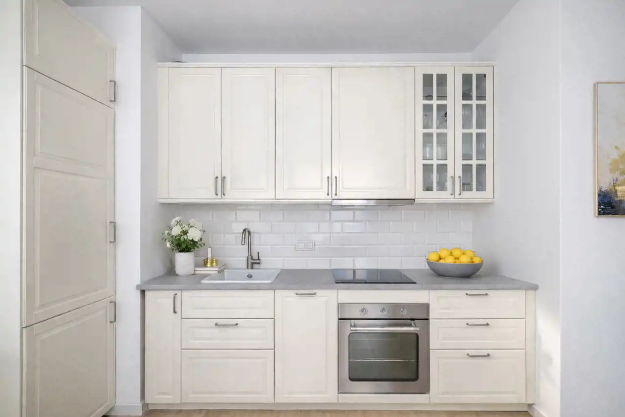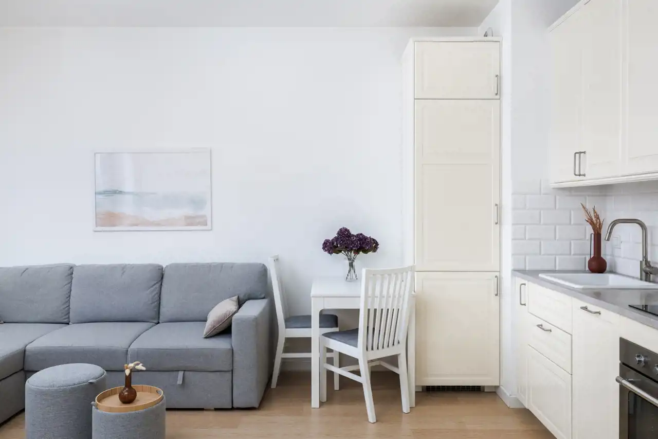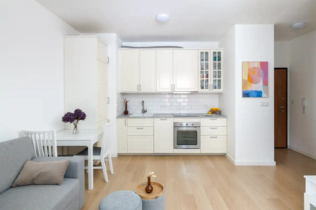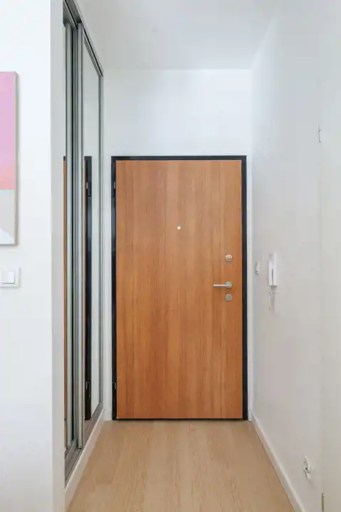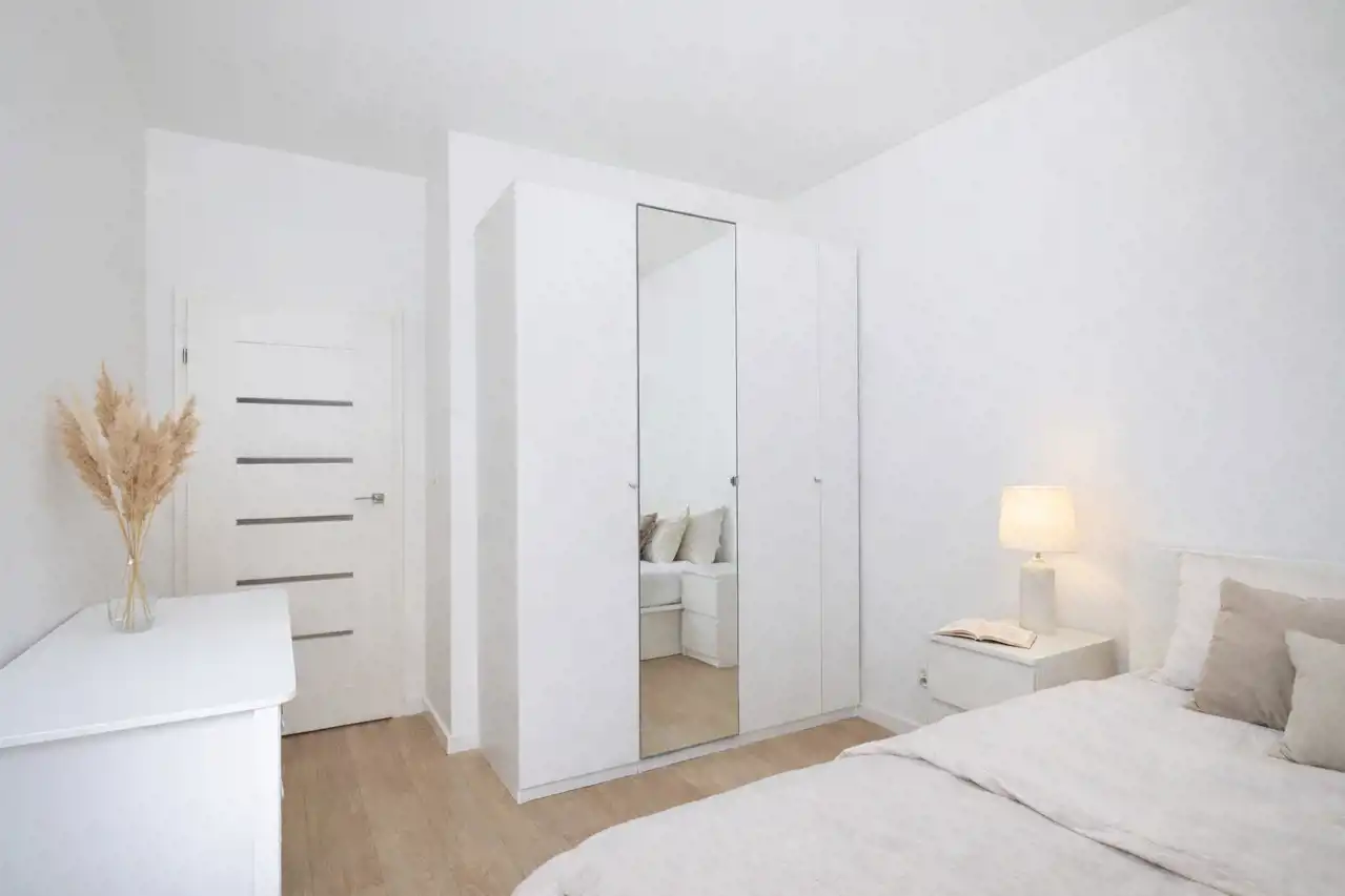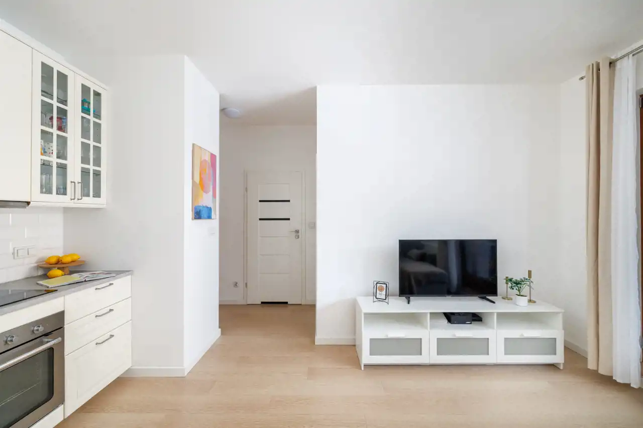 Wnętrze zostało urządzone funkcjonalnie i w nowoczesnym stylu. Duże okna zapewniają bardzo dobre doświetlenie pomieszczeń, a drewniana stolarka okienna z nawiewnikami i filtrami antysmogowymi wpływa na komfort codziennego użytkowania. Salon z aneksem kuchennym stanowi wygodną, otwartą przestrzeń dzienną z wyjściem na loggię. Aneks kuchenny wyposażony jest w meble w zabudowie, zmywarkę, płytę oraz piekarnik. Sypialnia z pojemną szafą oferuje komfortową przestrzeń do odpoczynku. W łazience znajduje się duży prysznic typu walk-in. Dodatkowe miejsce do przechowywania zapewnia szafa KOMANDOR w przedpokoju.
