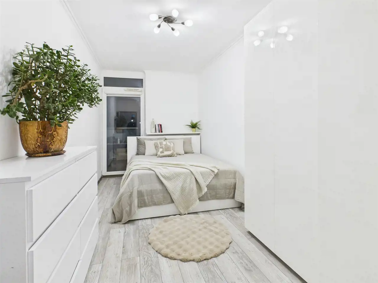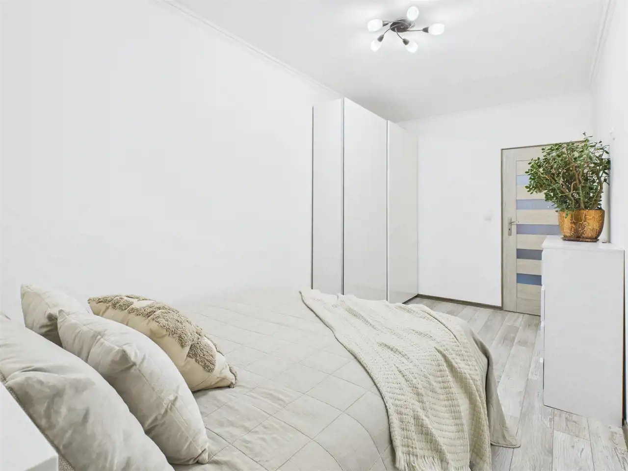 - Sypialnia – ustawna, z miejscem na duże łóżko i szafę