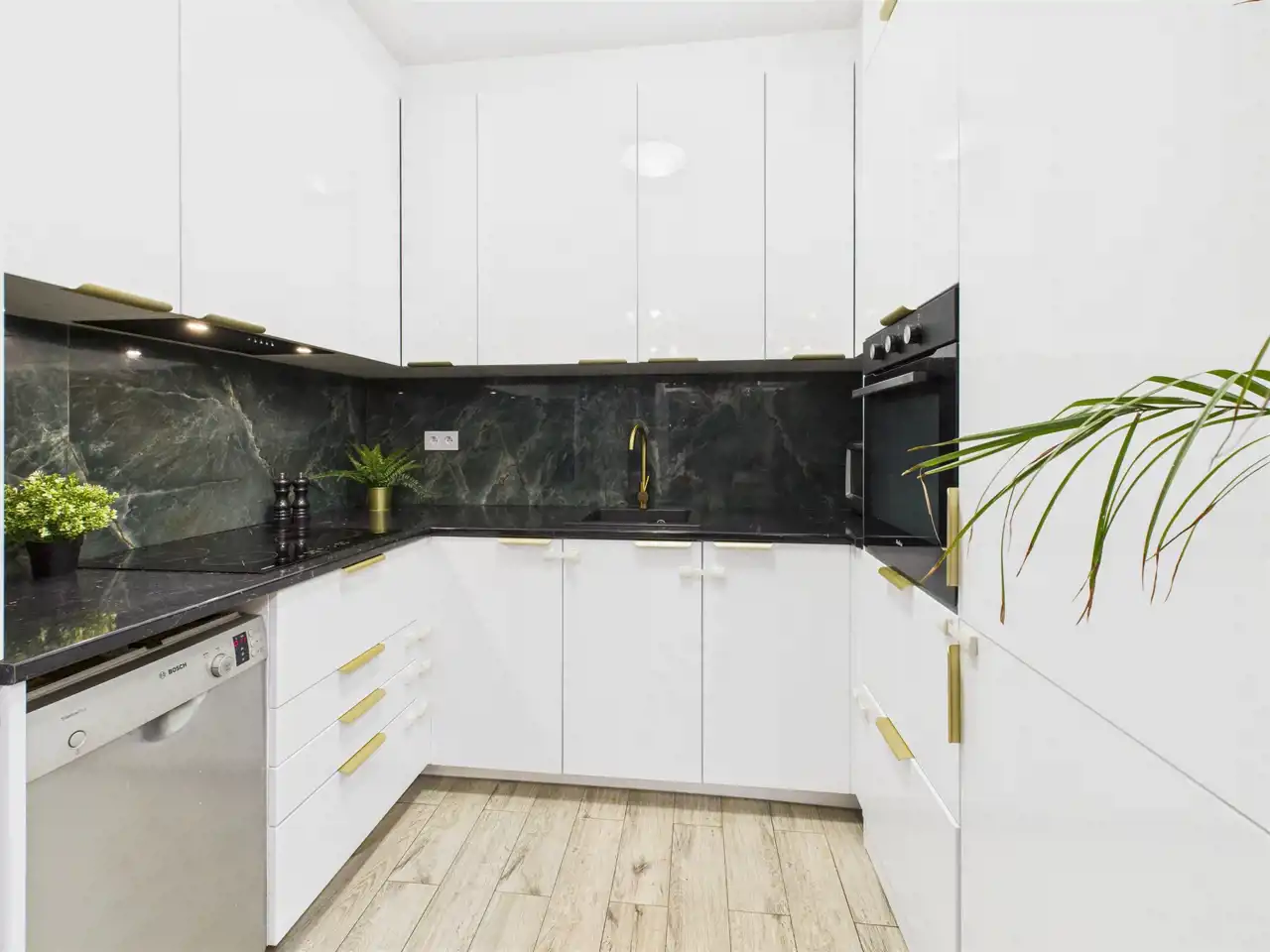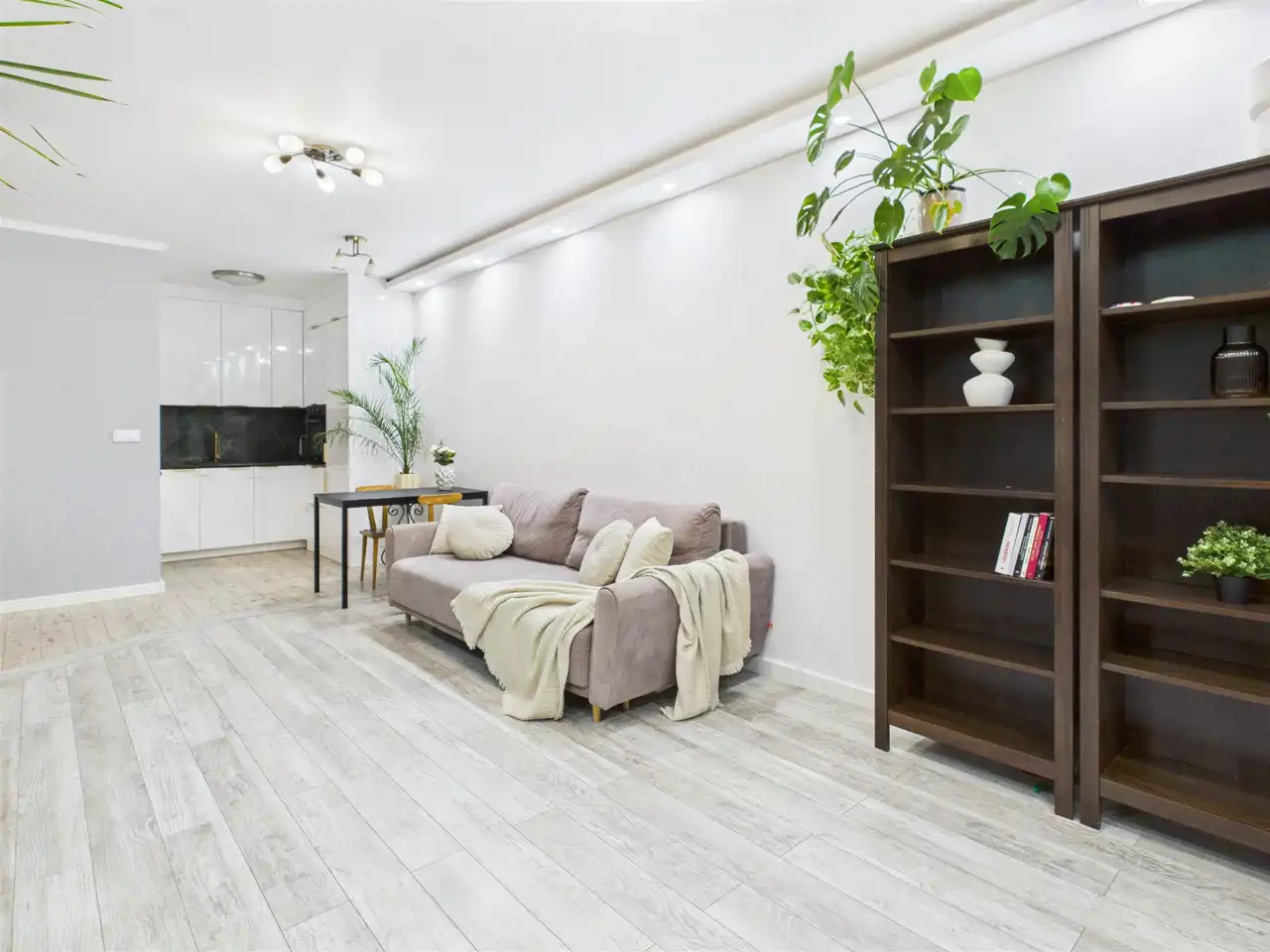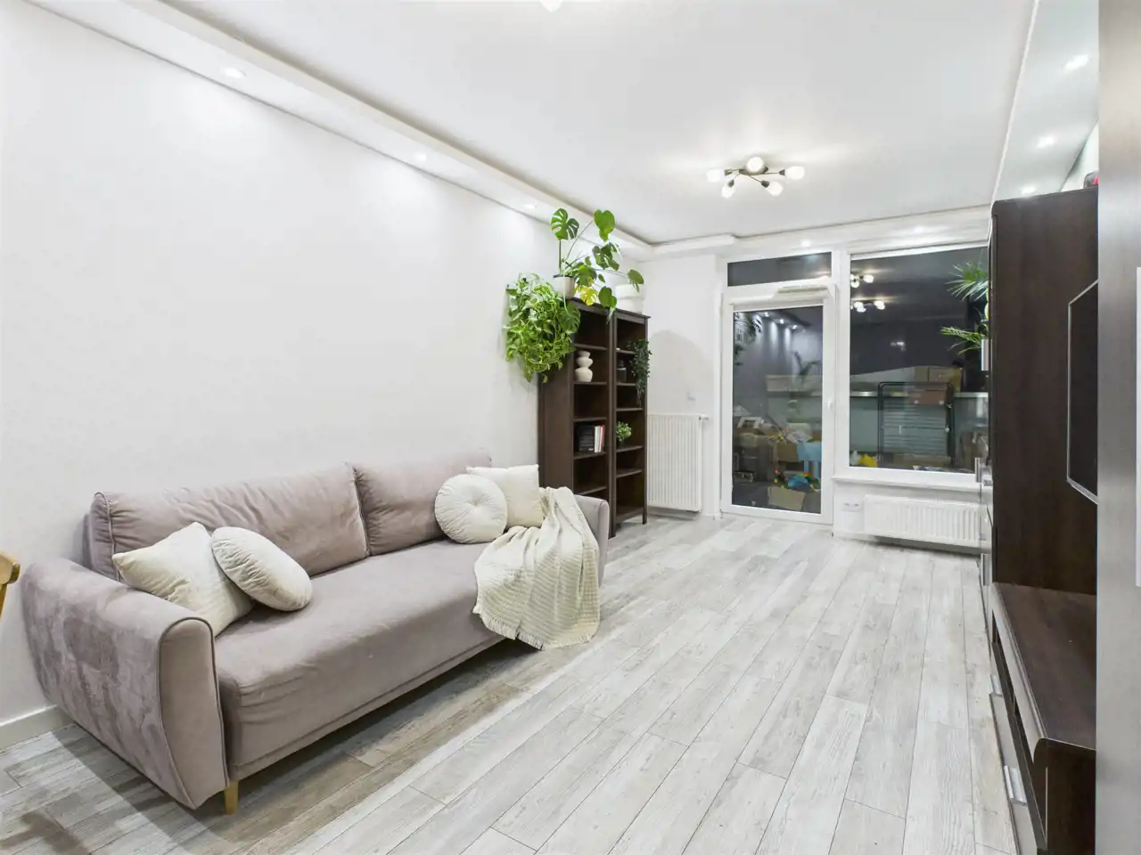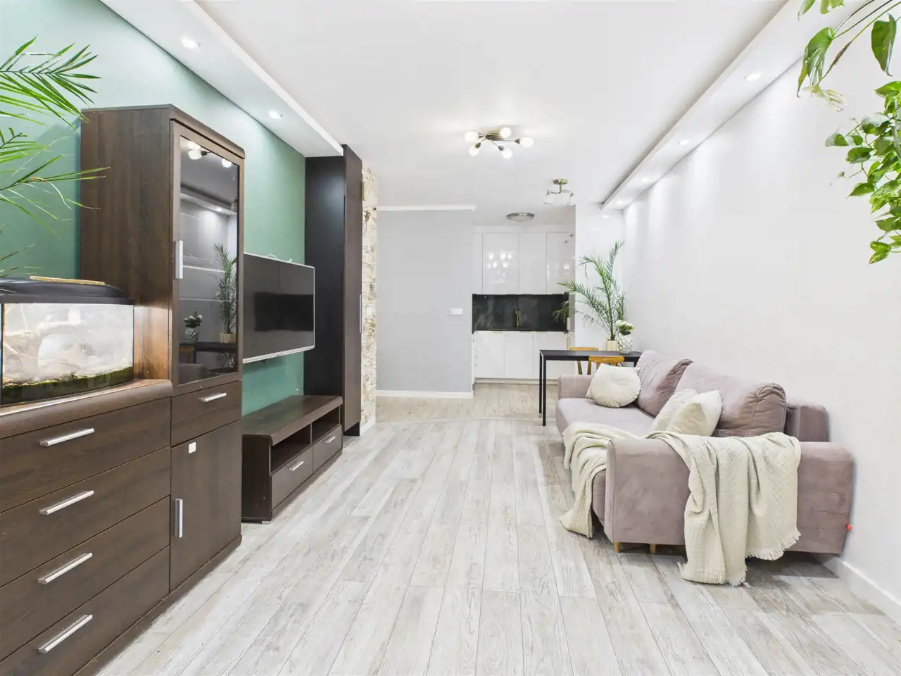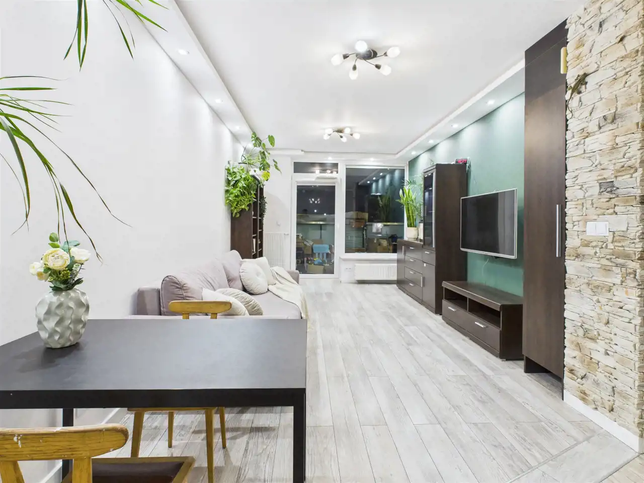 - Salon z aneksem kuchennym – jasna, otwarta przestrzeń dzienna