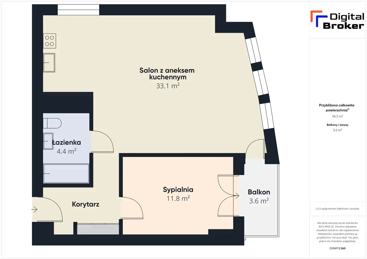 ✔ przestronny salon z aneksem kuchennym ok. 33,1 m2, z wyjściem na balkon