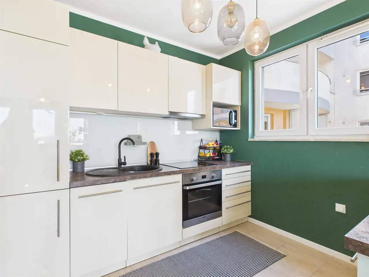 Funkcjonalna kuchnia wyposażona jest w zabudowę meblową oraz niezbędne sprzęty AGD – lodówko-zamrażarkę, płytę elektryczną, piekarnik i zmywarkę.