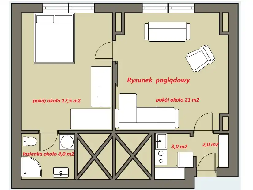 Z przedpokoju wejście do ciemnej niewielkiej kuchni a także ustawnego salonu ok 21 m2 z którego przechodzimy do mniejszego pokoju. Z tego pokoju wejście do łazienki.