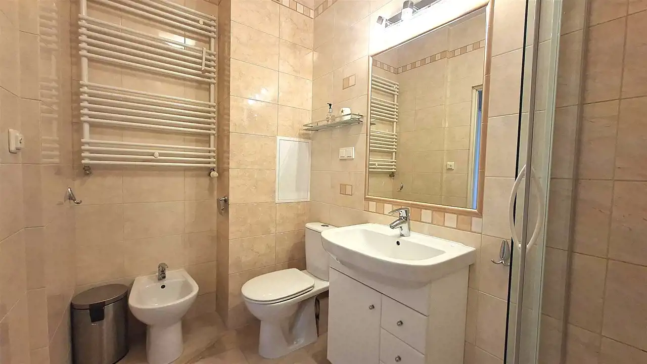 - wygodnej łazienki wyposażonej w kabinę prysznicową, wc, bidet i umywalkę