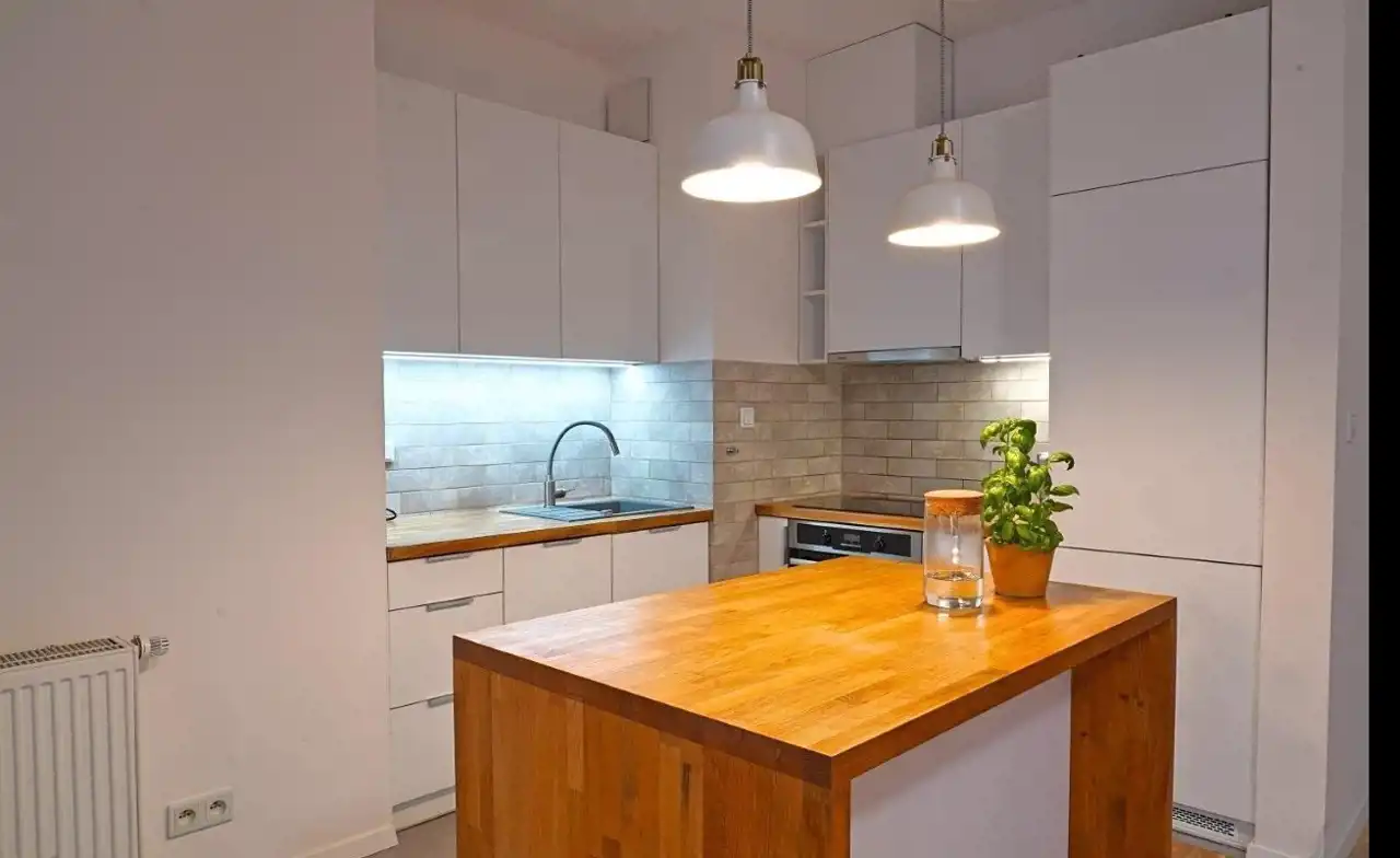 • Wysoka jakość wykończenia: Mieszkanie zostało zaprojektowane przez pracownię Mąka Sojka Architekci. W kuchni znajdują się meble skandynawskiej firmy, płytki z kolekcji Paradyż, a także markowe sprzęty AGD (Bosch, Elektrolux) Na uwagę zasługują drewniane, jesionowe podłogi w salonie i sypialni, a także grube blaty kuchenne, które zostały wykorzystane także na przedzielającej salon od kuchni wyspie. Łazienkę zdobią eleganckie płytki gresowe w naturalnych kolorach bieli i grafitu,