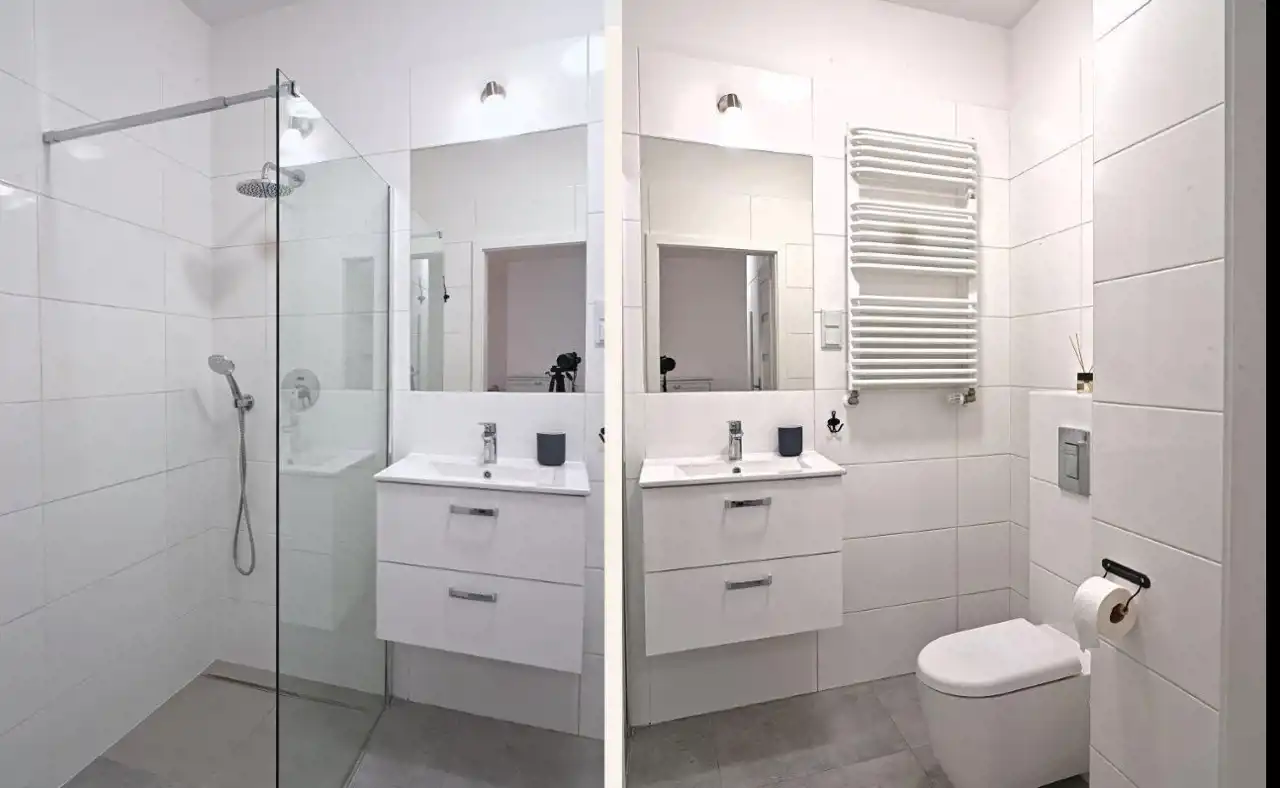 *Łazienki (4,18 m²) z prysznicem typu walk-in, wykończonej w nowoczesnym stylu