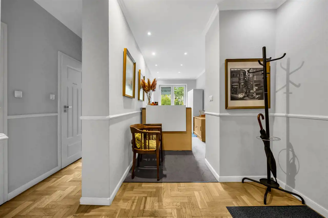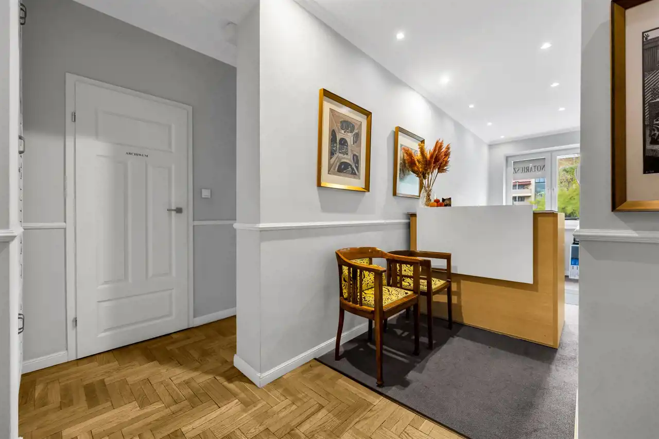 • Po prawej stronie, zaraz przy przedpokoju, znajduje się pomieszczenie, które w Księdze Wieczystej widnieje jako kuchnia, a obecnie pełni funkcję recepcji (z powodu prowadzonej kancelarii).