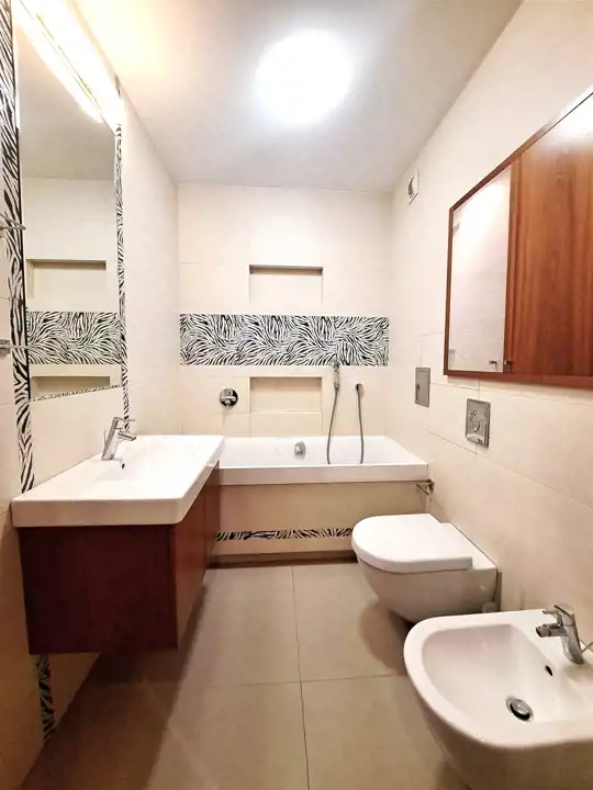 Apartment consists of a living room with kitchen, 3 bedroms and 2 bathrooms, laundry. Balcony 9 m2. Equipped and furnished.