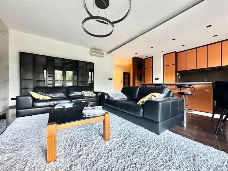 Przestronny salon z wyjściem na balkon z widokiem na zieloną część Powiśla