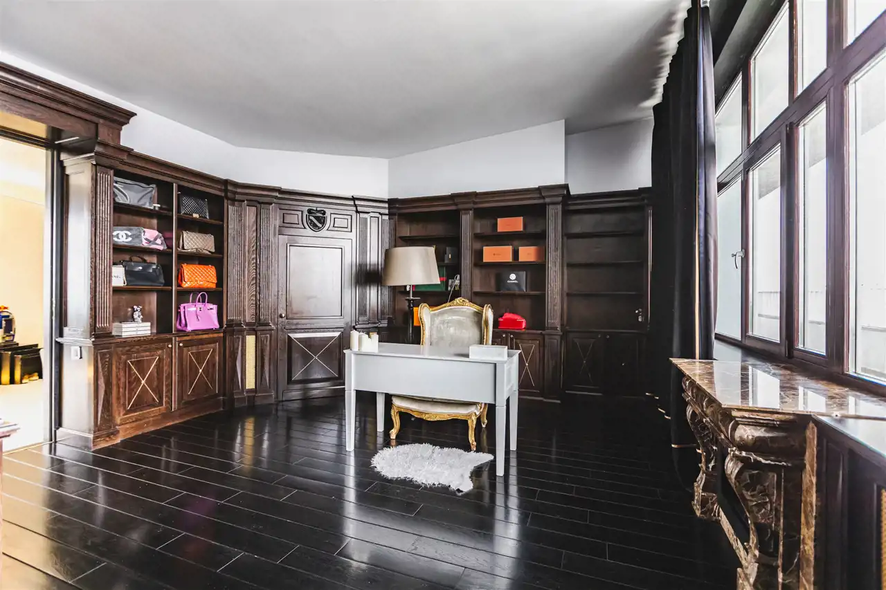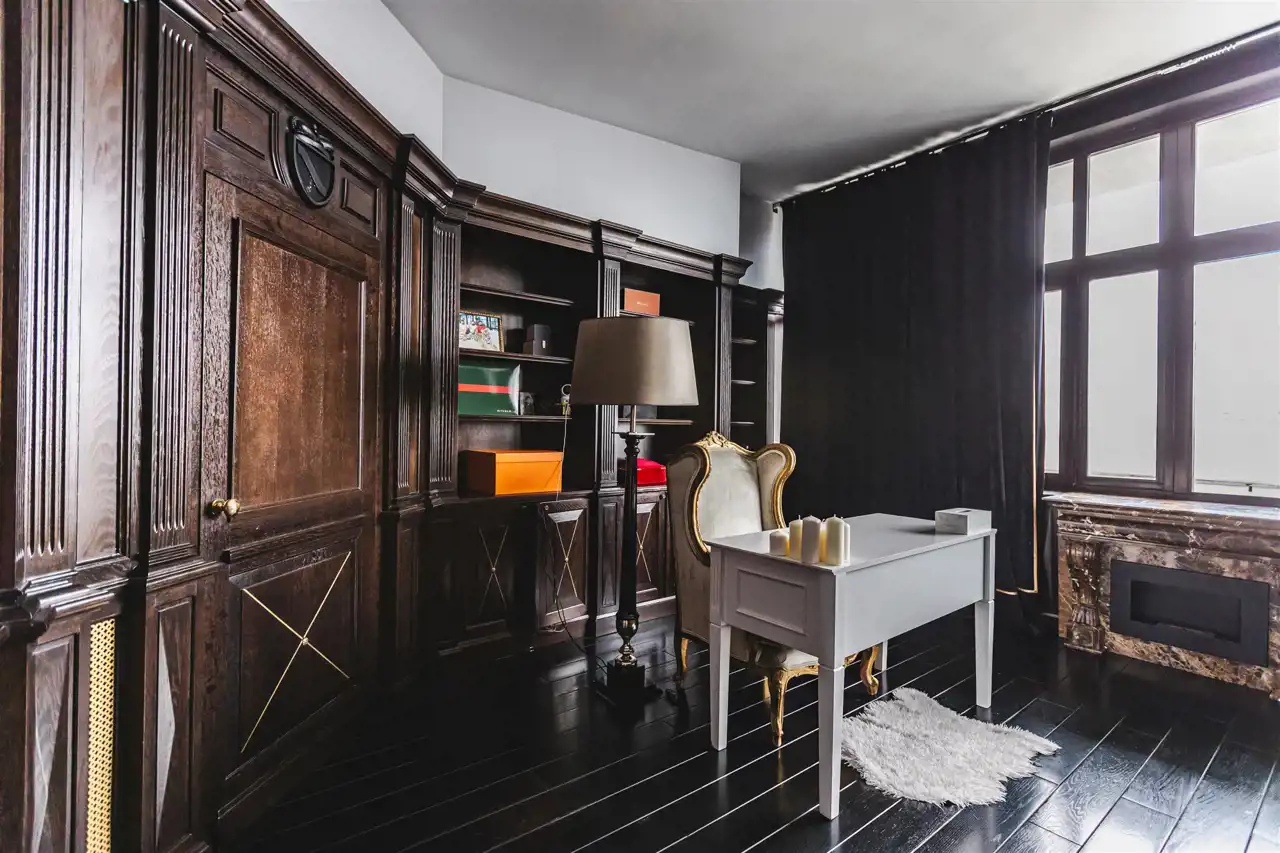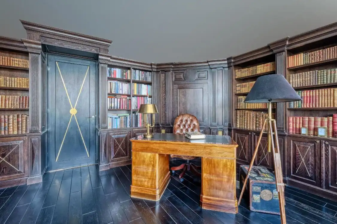 5. Gabinet z kominkiem marmurowym i zabudowany dębową biblioteką wykonaną na zamówienie z wyjściem na kolejny taras.