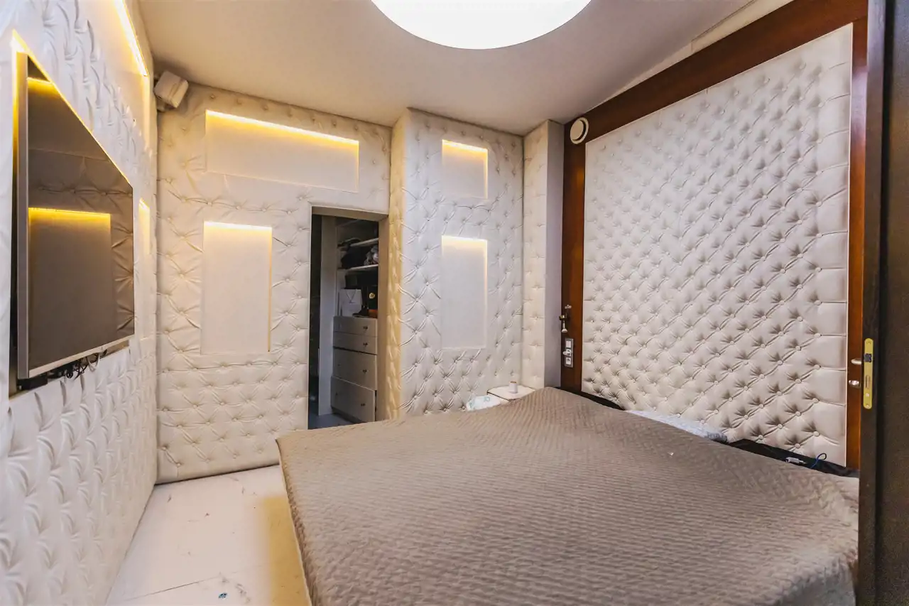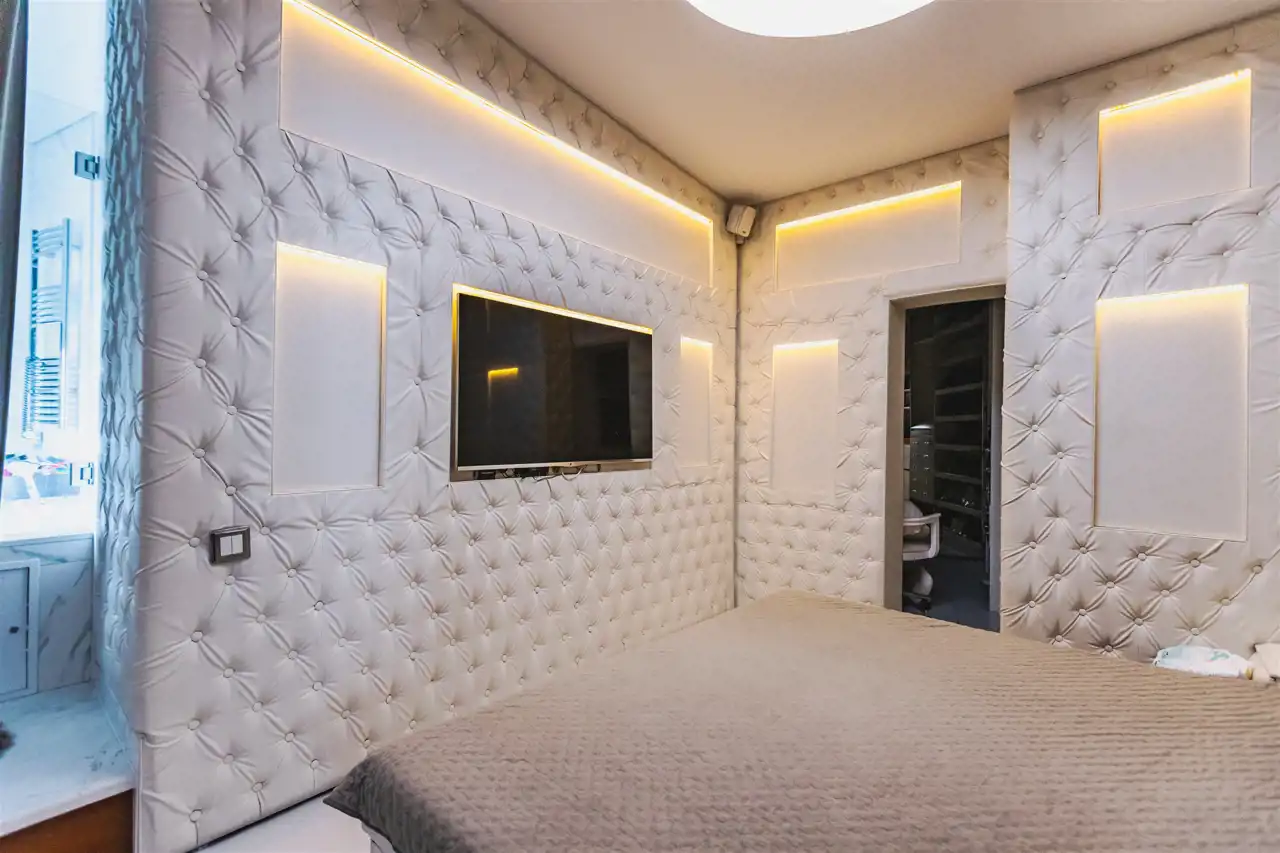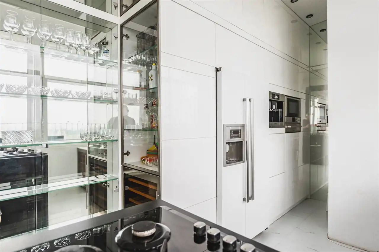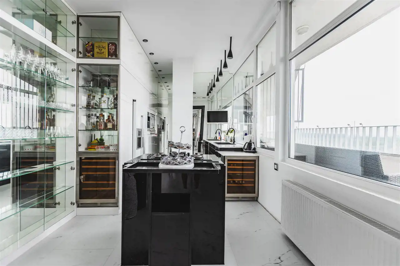 Penthouse wyróżnia się bardzo gustownym, jasnym wnętrzem, zaprojektowanym przy użyciu najlepszej jakości materiałów: marmur, drewno dębowe i egzotyczne, mosiądz oraz sprzętu: marki BOSCH, Samsung oraz Apple.