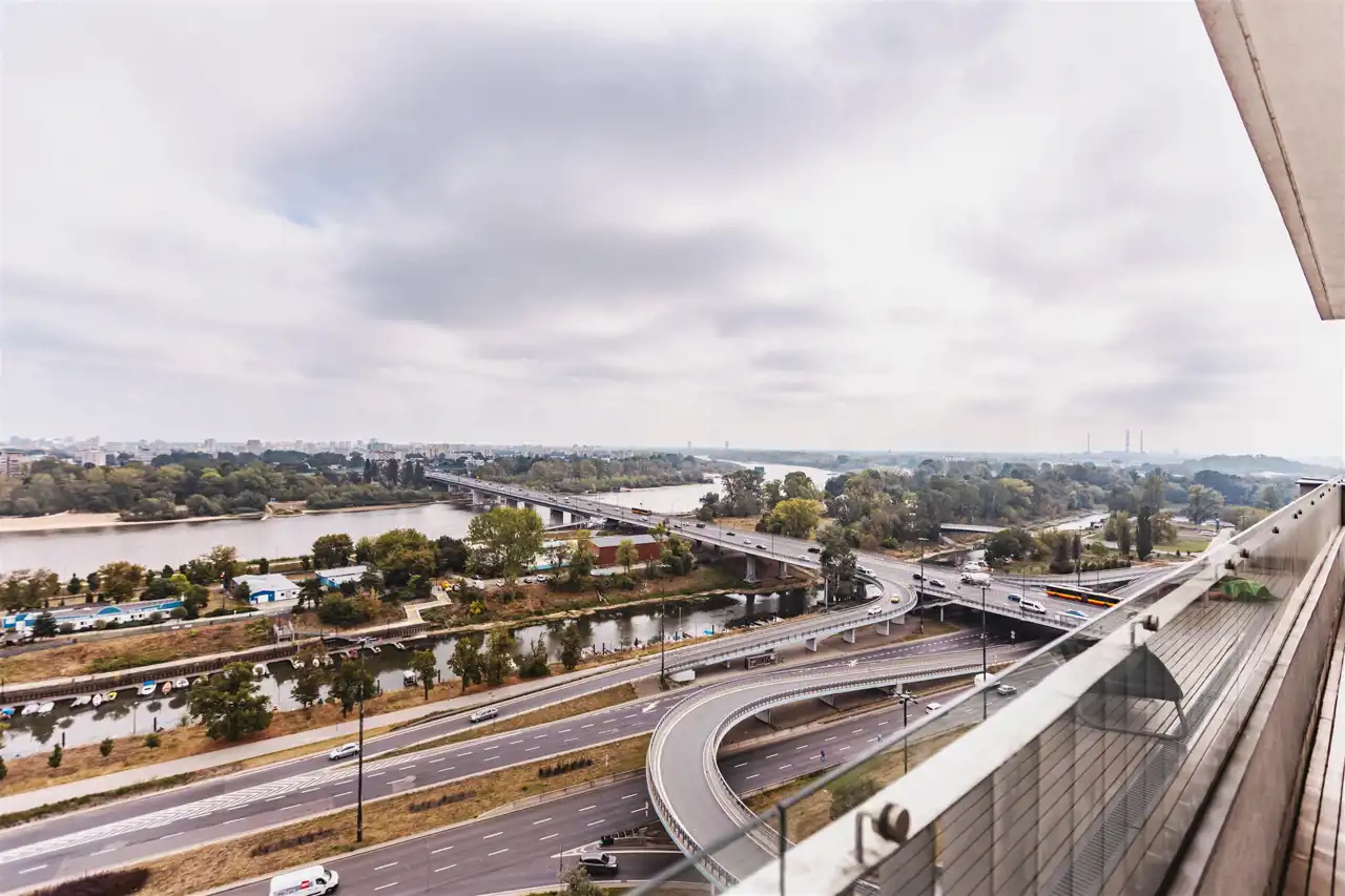 Z czterech stron widać wszystko w promieniu kilku kilometrów. Penthouse mieści się oczywiście na najwyższym, ostatnim piętrze i stanowi około 3/4 całego piętra. Poza tym na piętrze jest jeszcze tylko jeden apartament. Budynek jest najwyższy w okolicy i dzięki swojemu ustawieniu przy Wiśle zapewnia zapierające dech w piersiach spektakle słoneczne. Piękne wschody i zachody słońca jak też widok na Pałac Kultury, Zamek Królewski, Stadion Narodowy, marinę i zakole Wisły. Do Penthousea przynależy ponad 100 m2 tarasu z trzech stron a wielkie okna składają się na prawie całe ściany zewnętrzne. Piętro na, którym jest apartament posiada najwyższą wysokość z całego budynku i zaczyna się od ponad 3 m do 3,5 m wysokości. Penthouse ma wyjątkowo dobre rozłożenie i jest niezwykle jasny i słoneczny.
