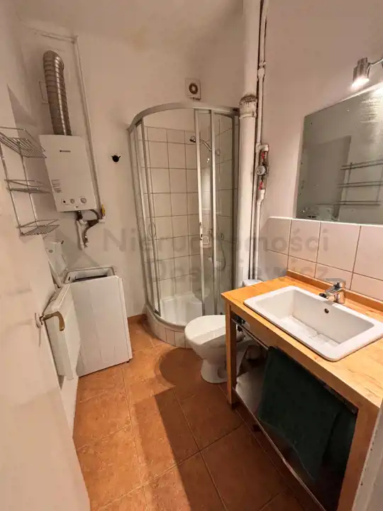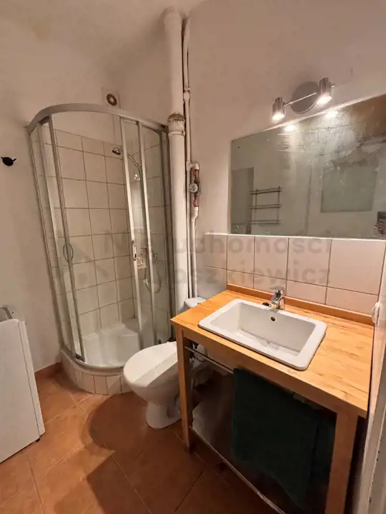 Łazienka o pow. 3.4m – glazura, terakota, kabina prysznicowa, umywalka, pralka, wc.