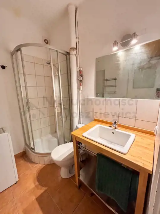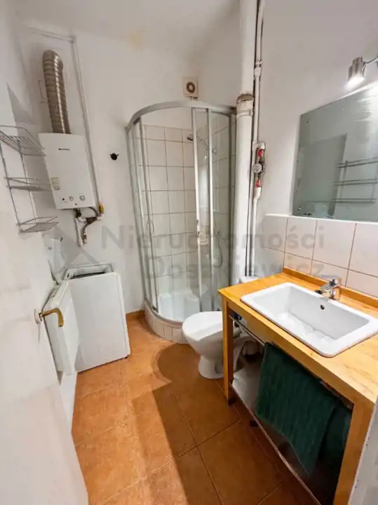 Łazienka o pow. 3.4m – glazura, terakota, kabina prysznicowa, umywalka, pralka, wc.
