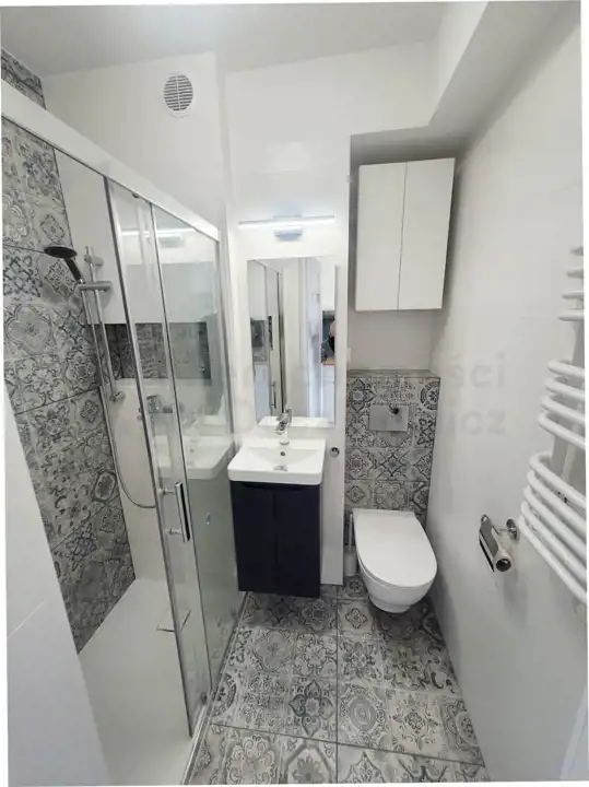 Łazienka została wykończona nową glazurą i terakotą, wyposażona jest w umywalkę z szafką + lustro z oświetleniem, wygodną kabinę prysznicową, wc oraz szafkę wiszącą.