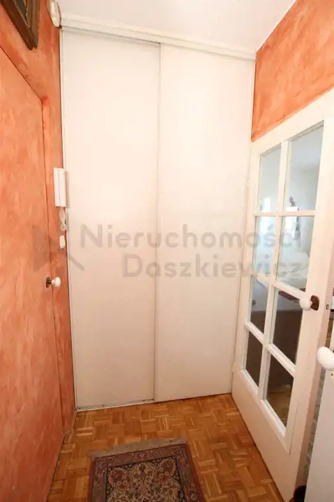 W przedpokoju na podłodze mozaiką, na wyposażeniu szafa wnękowa.